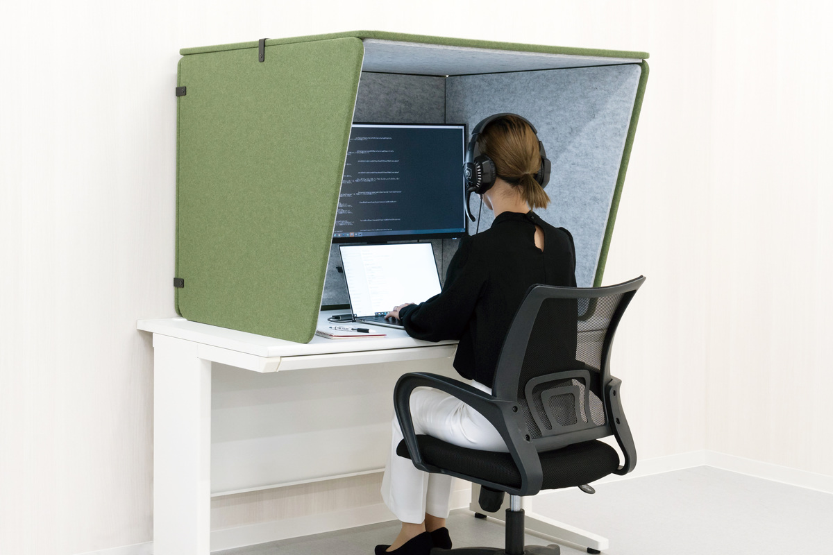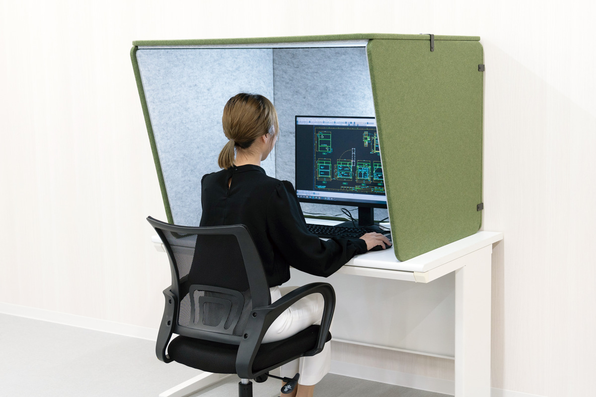 吸音効果で相手に届くノイズを軽減する『リミュートシリーズ』のデスクブース(ワイド)です。テレワークの相手やお客様に、自分の声以外のノイズが届きにくくなり、スムーズに会話ができます。また、設計・開発・エンジニアなど集中力が求められる作業時も、視界をほどよく遮りながら作業に没頭できる環境をつくります。