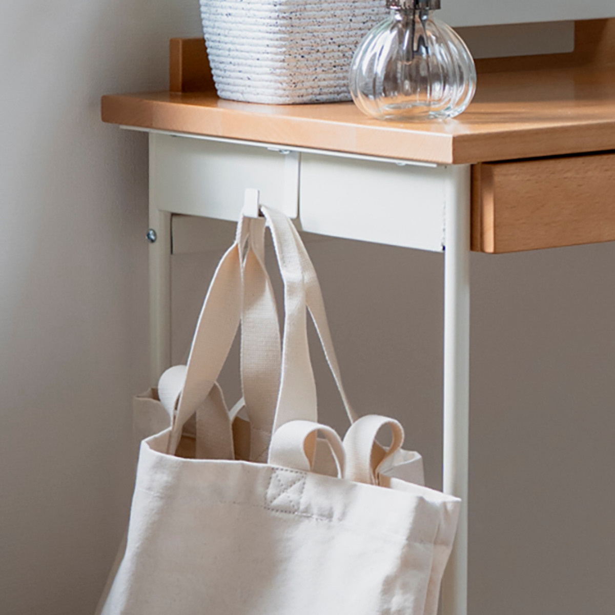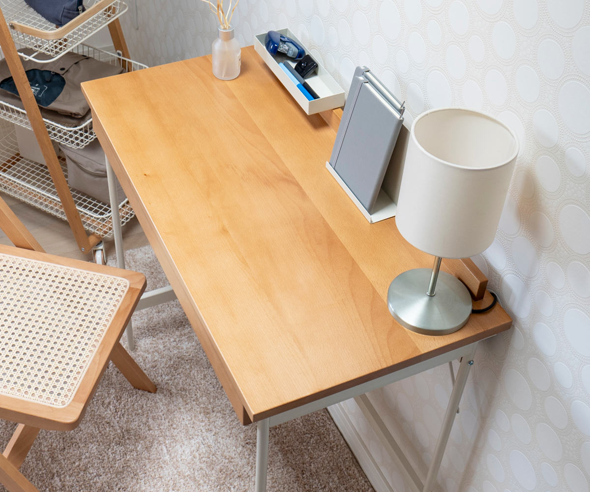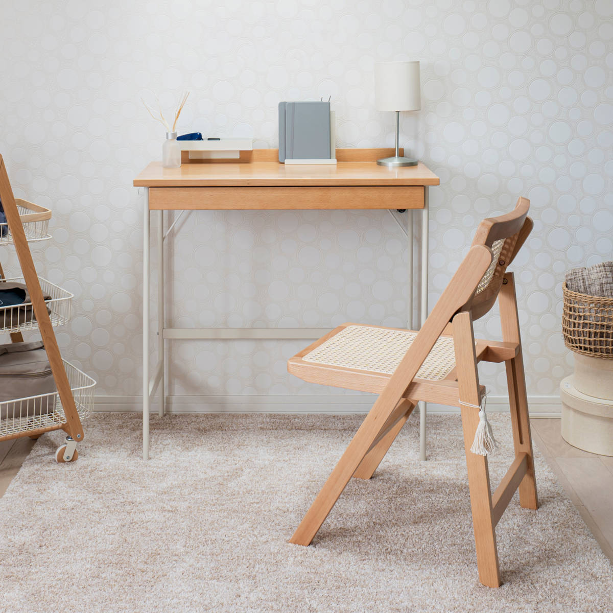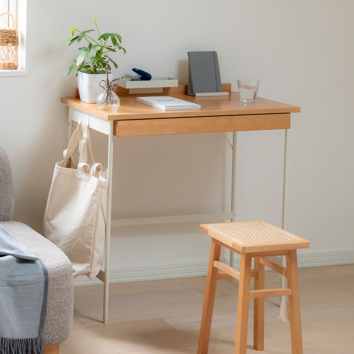 天然のビーチ材とホワイトスチールを組み合わせた、やさしい印象のワークデスク。リビングや子供部屋にも自然に溶け込み、お子様の学習机としてはもちろん、大人のワークスペースや趣味用デスクとしても活躍します。家族でシェアしやすいシンプルなデザインです。