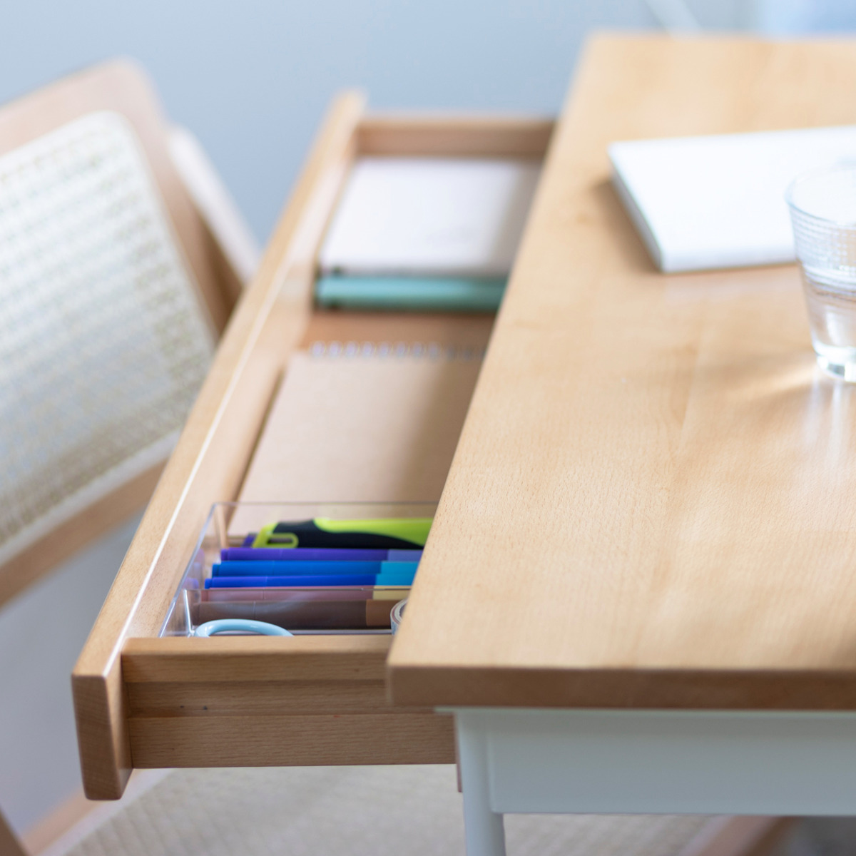 天板下には幅広の引き出しを備え、文房具や書類などの小物をまとめて収納可能です。必要なものを手元にしまえて、スリムながら机上を広く使えます。