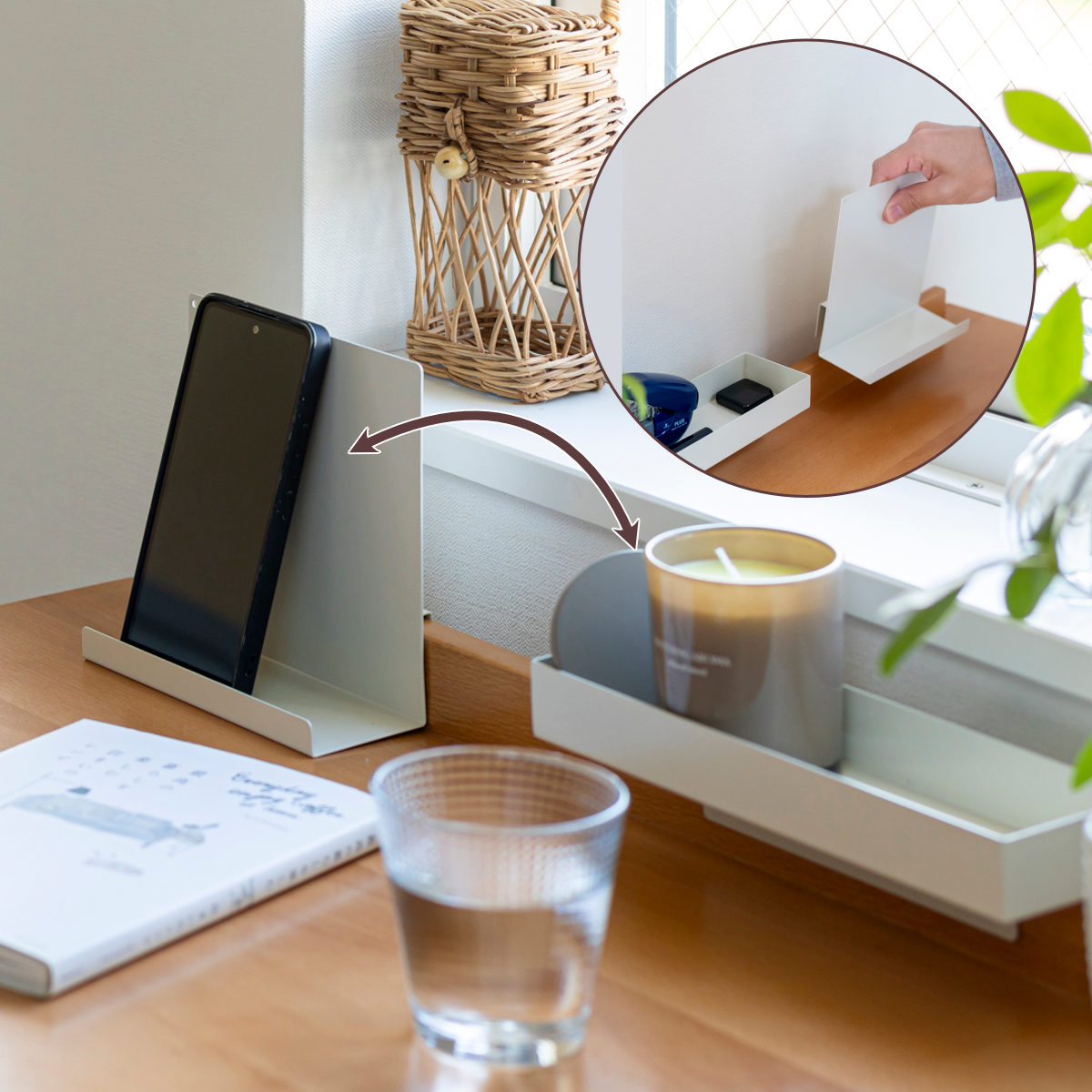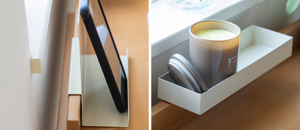 スマートフォンやタブレットを立て掛けられるスタンドと、文房具などを収納できるトレーが付属しています。天板奥の貫部分に差し込む仕様で、使いやすい位置に移動したり、不要なときは取り外すこともできます。