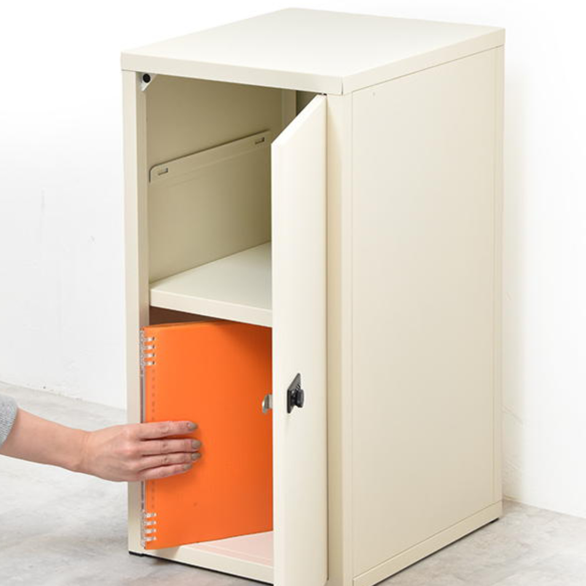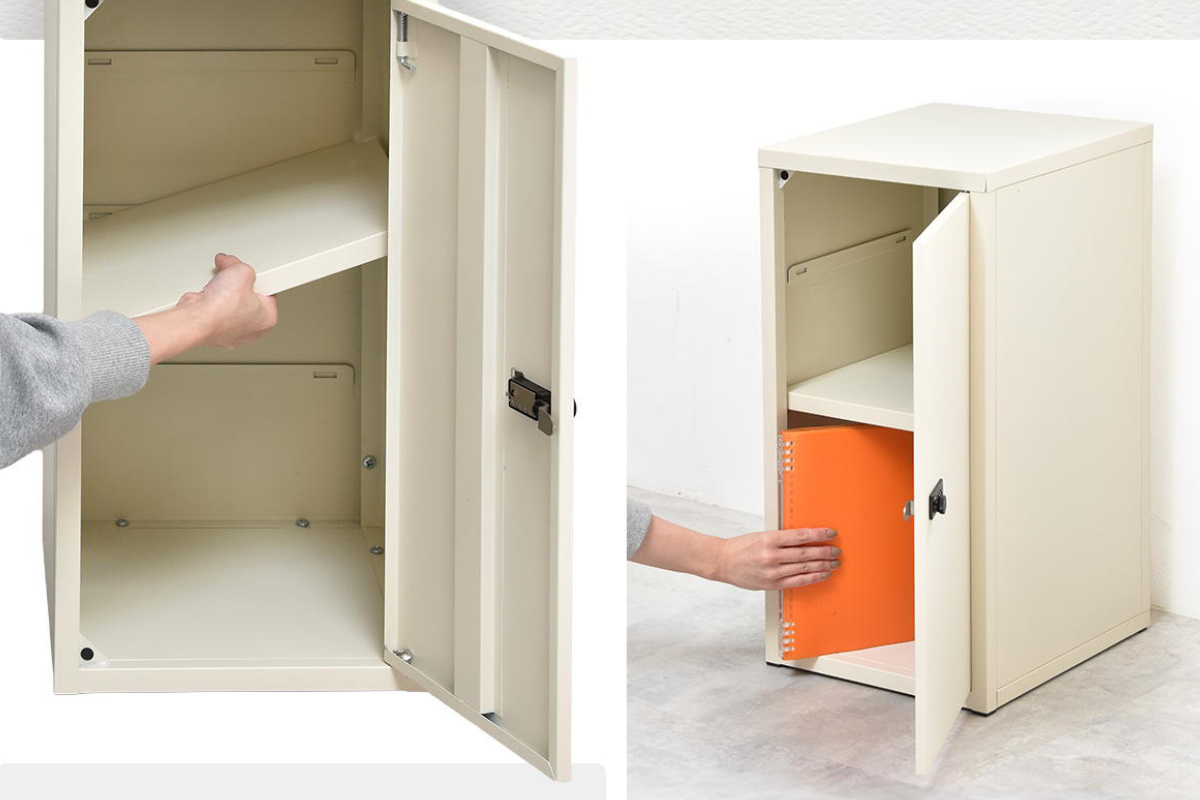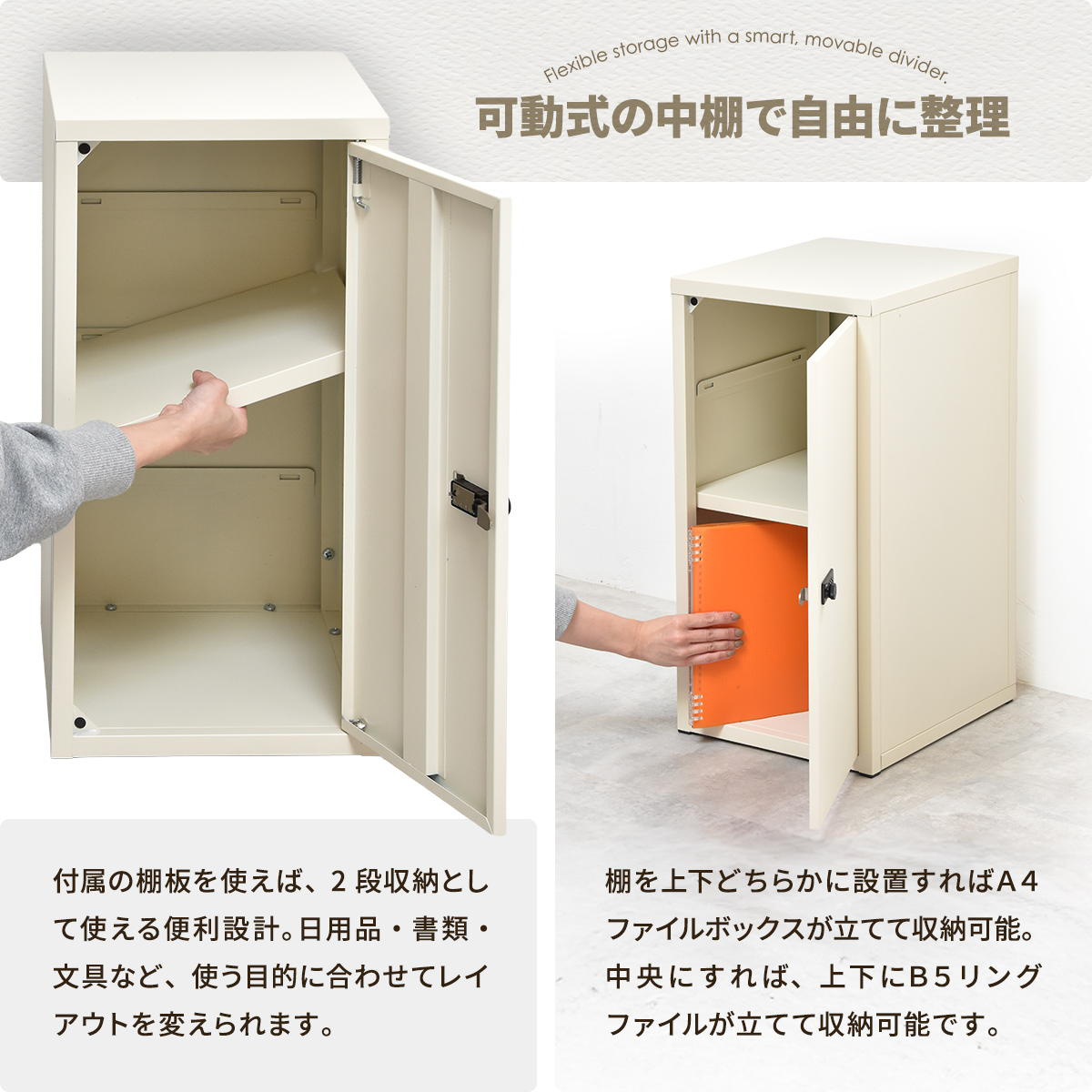 付属の可動棚板で2段収納に変更可能。棚を上下どちらかに設置すればA4ファイルがすっきり収まり、中央に設置すれば上下にB5リングファイルを効率よく整理できます。用途に合わせて自由にカスタマイズできる便利な仕様です。