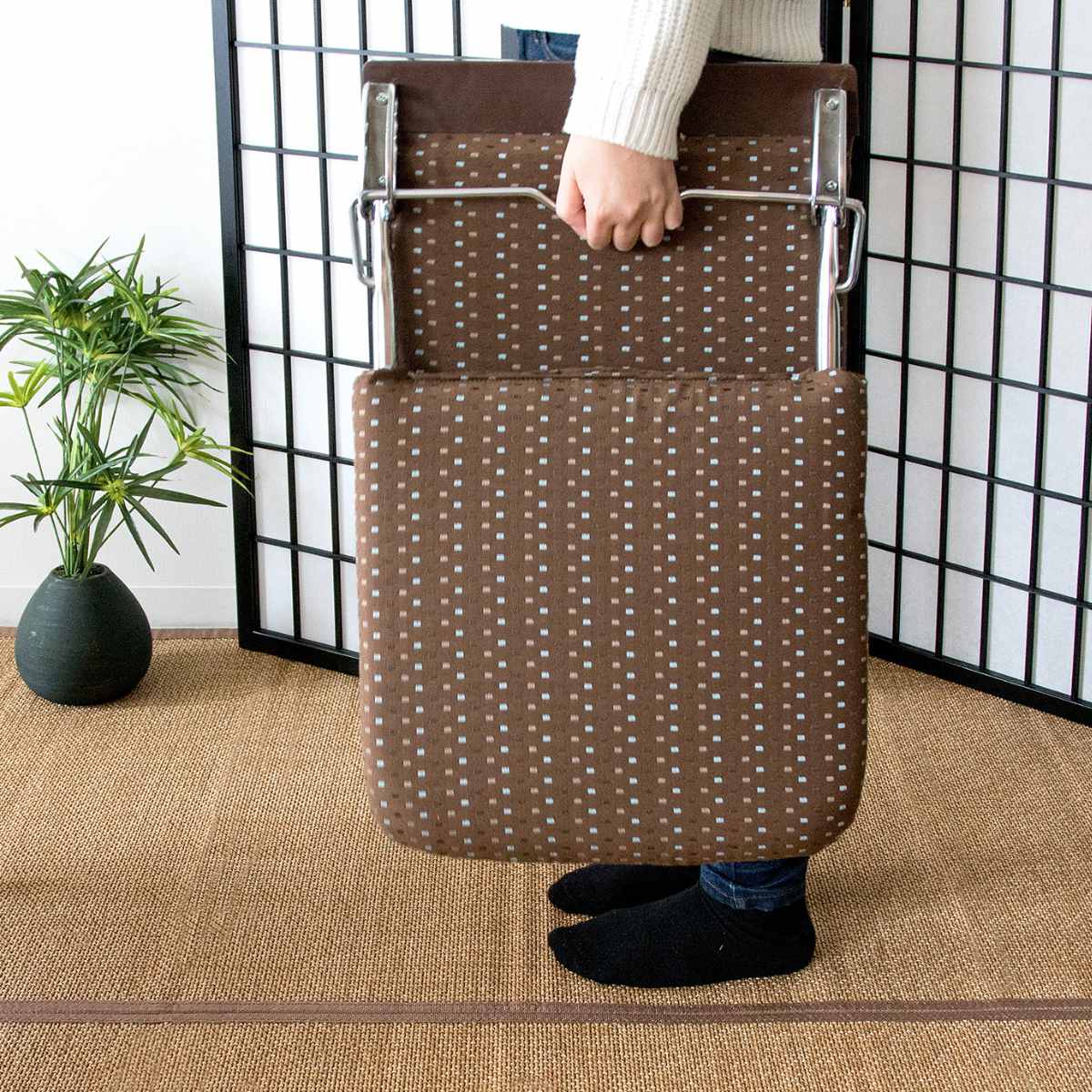 座椅子は背もたれを前に倒すだけで簡単に折りたたむことができます。壁や家具の間に立てかけたり、ベッド下の隙間などにも収納可能です。掃除の際や来客時にも邪魔にならず、無理なく取り入れられます。