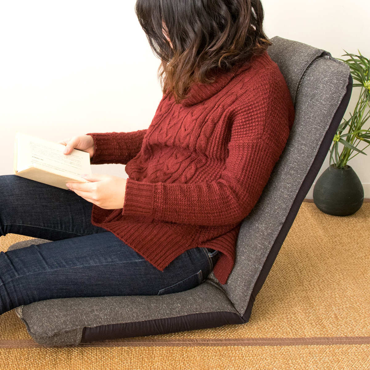 座面はゆとりのあるサイズ感で、男性でも無理なく座れる設計です。クッション性に優れたウレタンを、耐久性の高いチップウレタンで包み込み、床に近い姿勢でも安定した座り心地を保ちます。