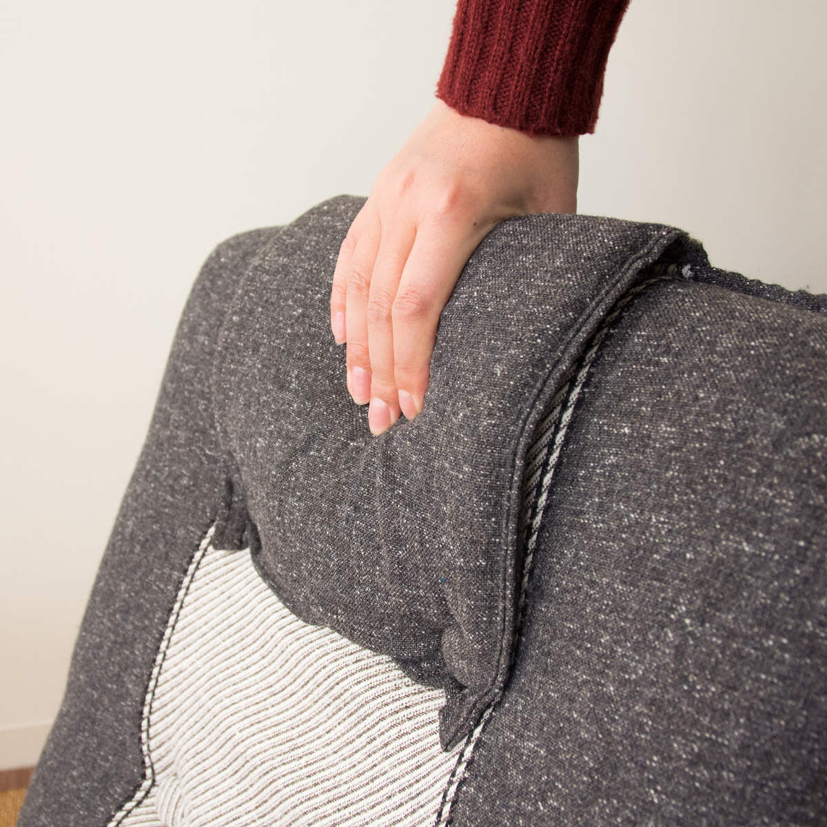 素材感の異なる生地を組み合わせた切り替えデザインを採用。素材感の違いにより張地にメリハリが生まれ、落ち着いた空間にもなじみやすい仕上がりです。