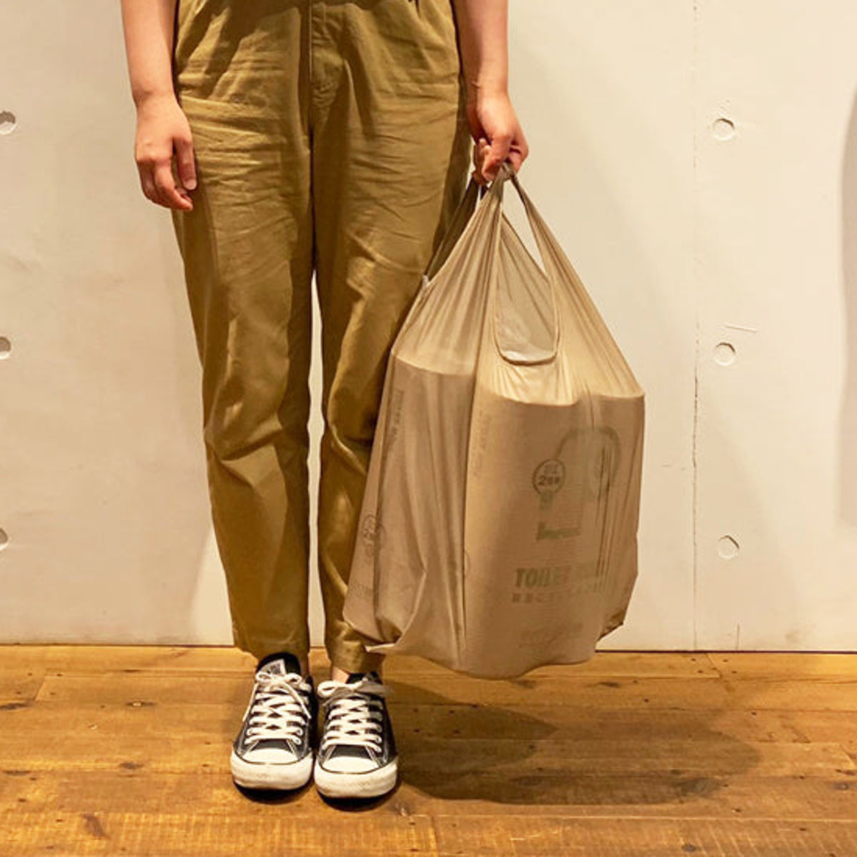 コンビニなどでの買い物に便利なエコバッグです。トイレットペーパー12ロールパックが収納可能なサイズです。