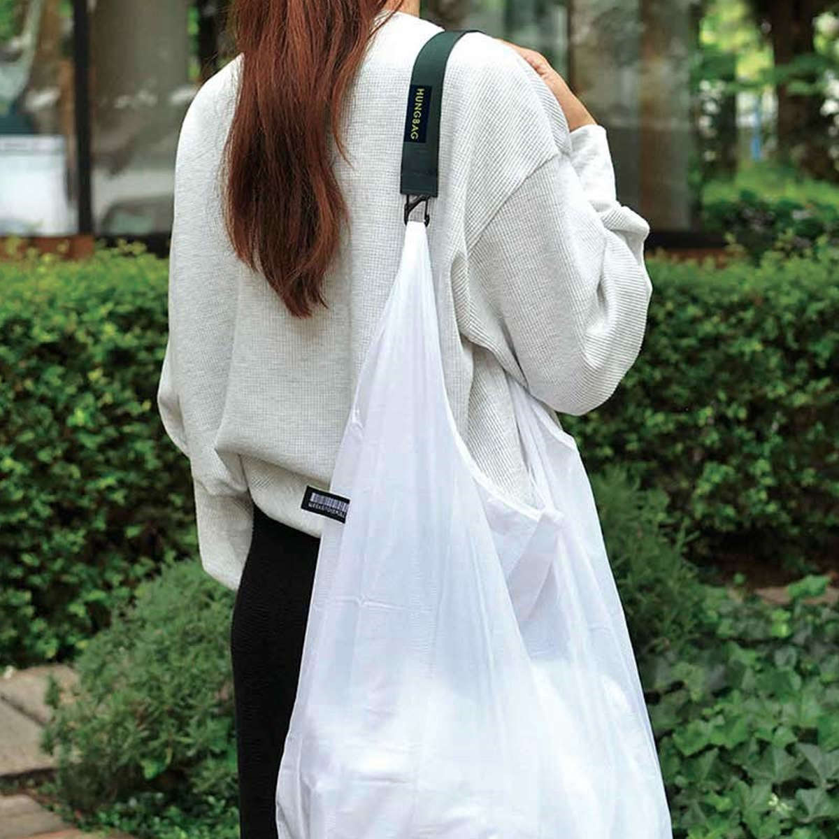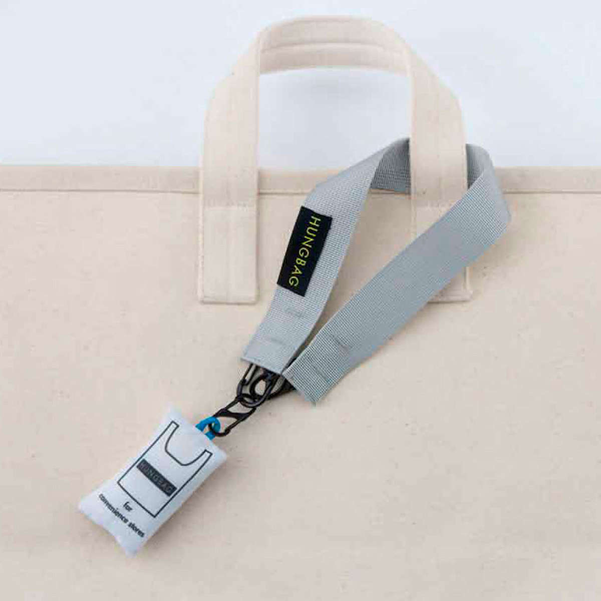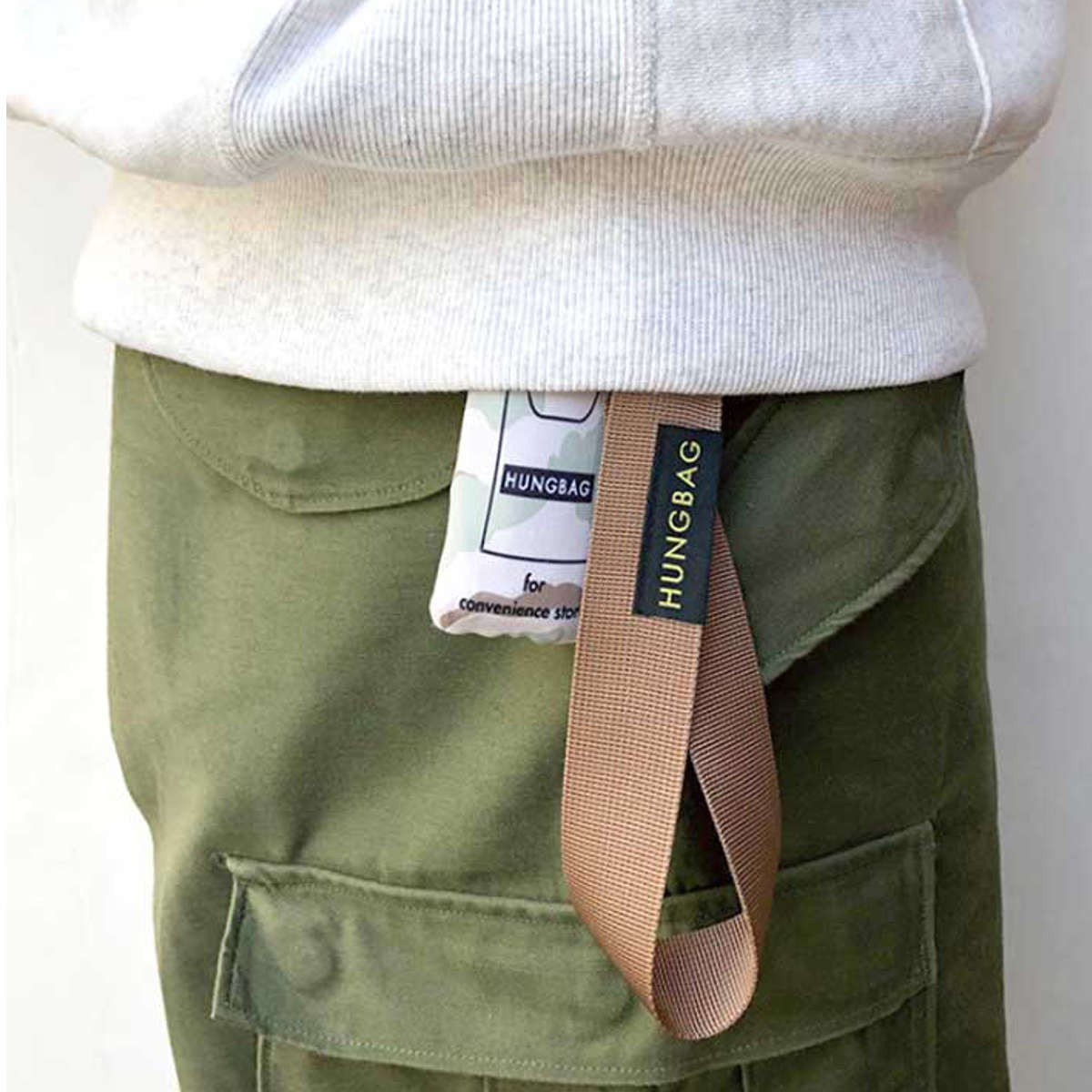 ストラップをバッグやベルトループに付けておくことで、HUNGBAGを常に携帯でき、エコバッグを忘れがちな人にも便利です。