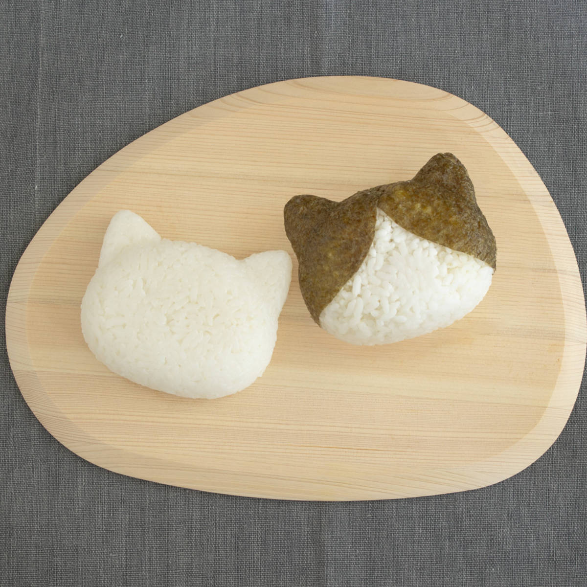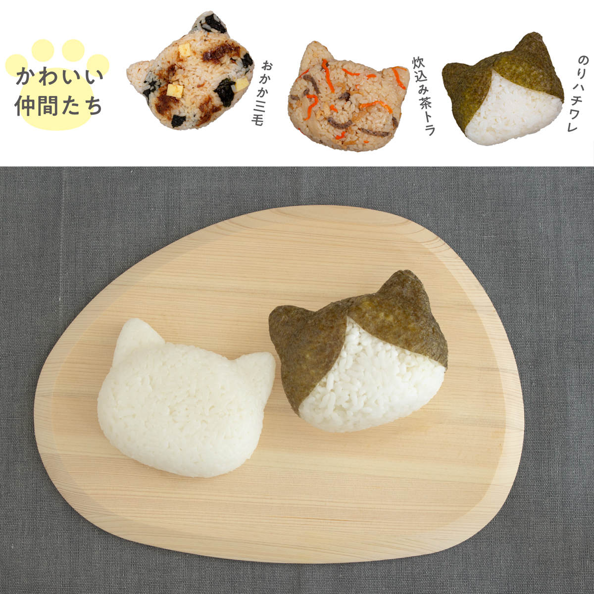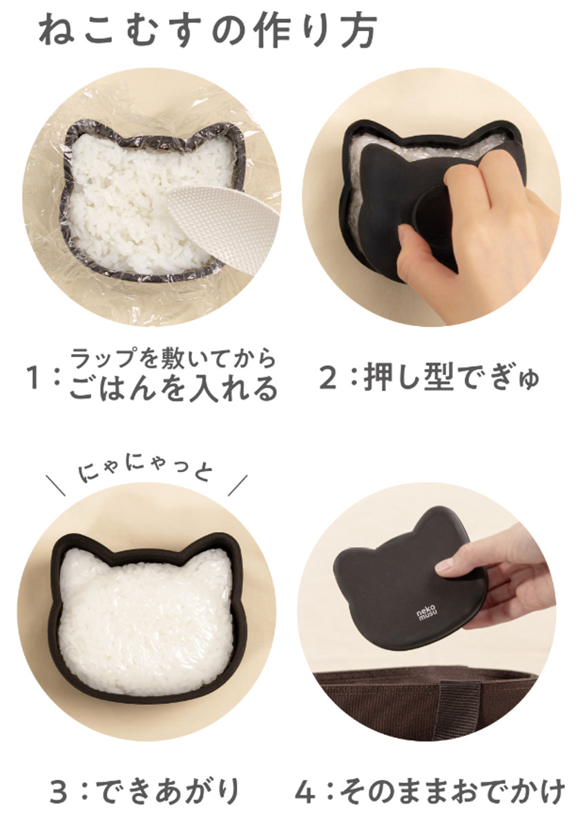 かわいい猫の形をしたおにぎりが作れます。塩むすびに海苔を使うことでアレンジは無限に広がります。お気に入りのキャラクターを作って楽しいランチタイムを過ごせます。