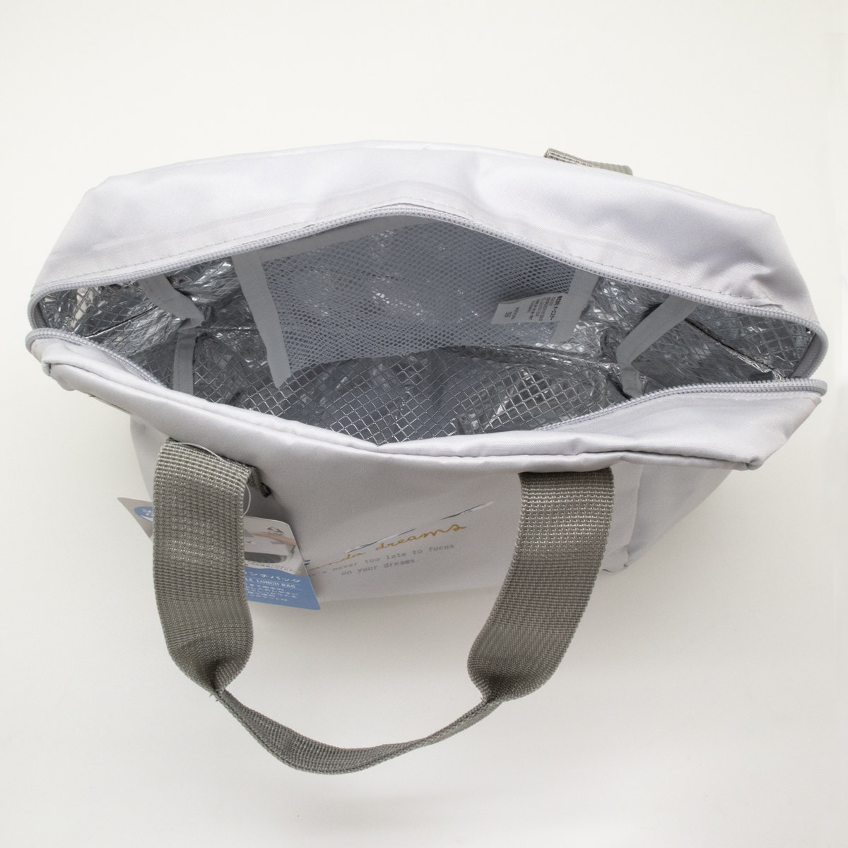 ●内側は保冷効果が続くアルミ仕様で、保冷剤を入れられるメッシュポケットも付いています。