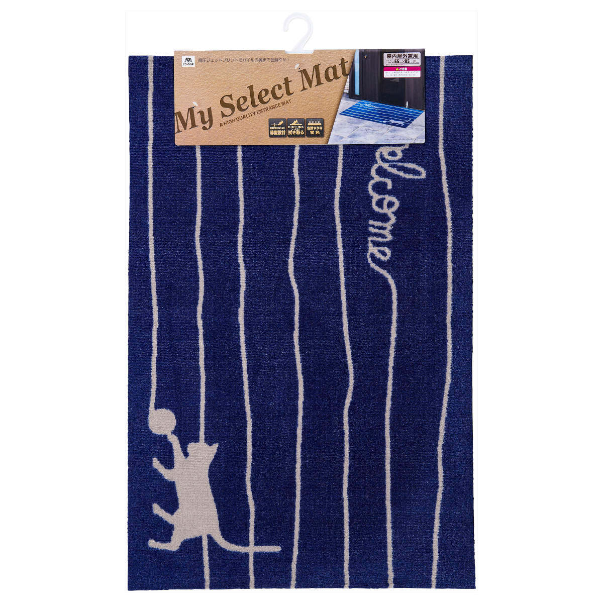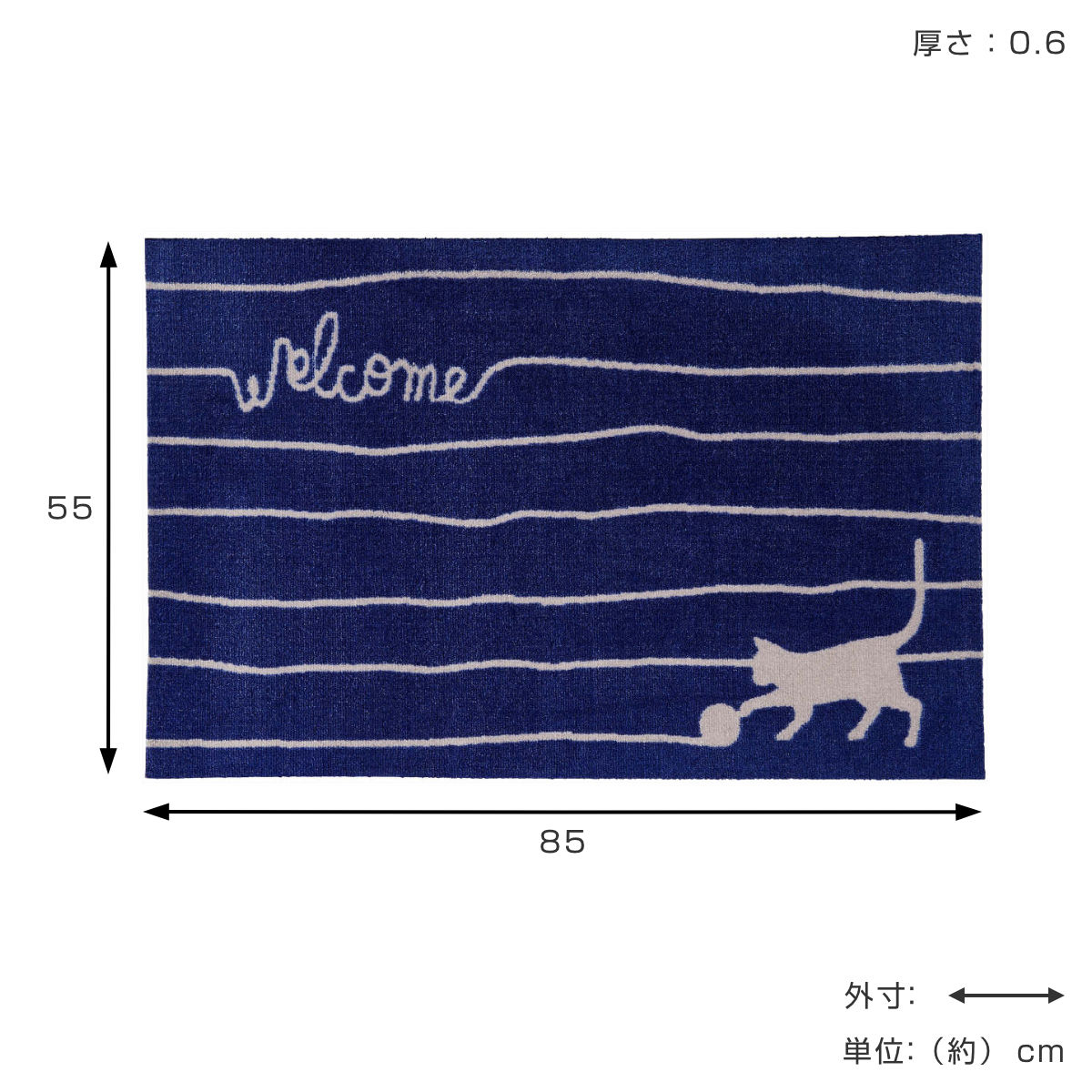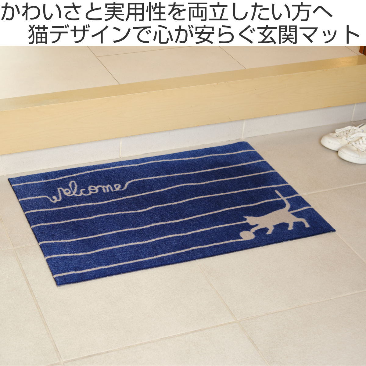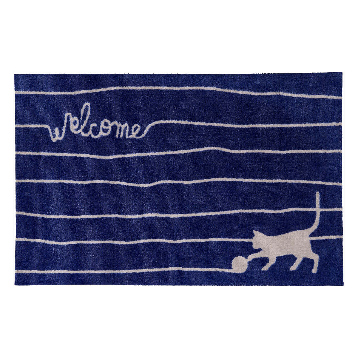 かわいい猫のデザインが特徴の玄関用マットです。高圧ジェットプリントで色鮮やかに猫が表現されています。毛糸で作られた「welcome」の文字もオシャレです。