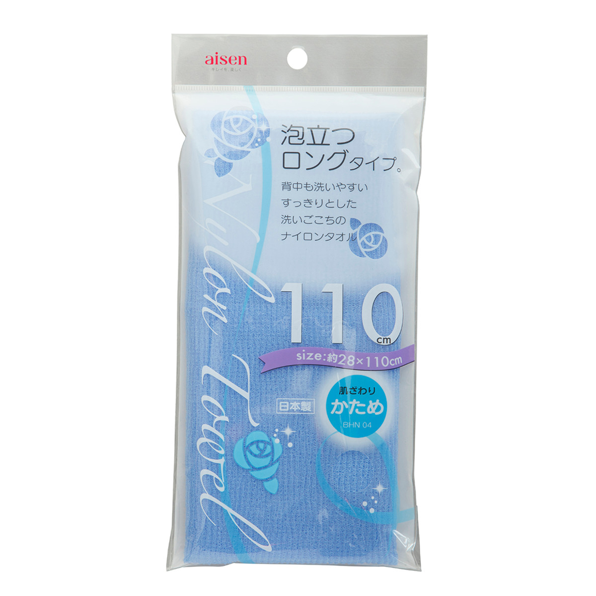 少なめのソープでも泡立ちがよく、ほどよい刺激ですっきりとした洗いごこちのナイロンタオルです。110cmのロングサイズで、体の大きな方も背中が洗いやすいです。