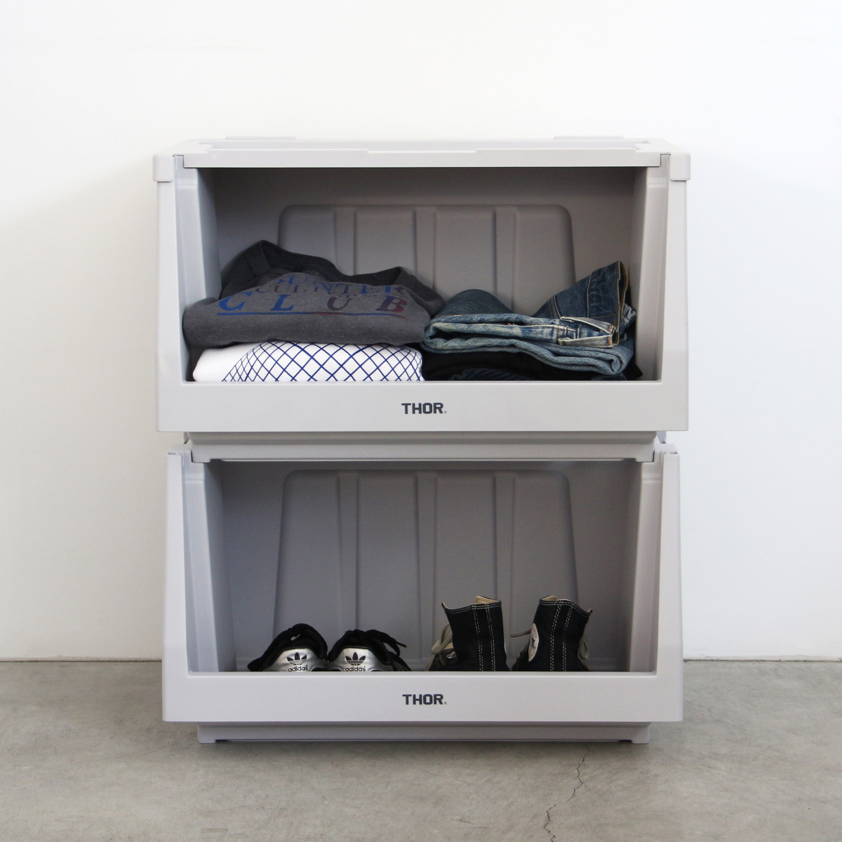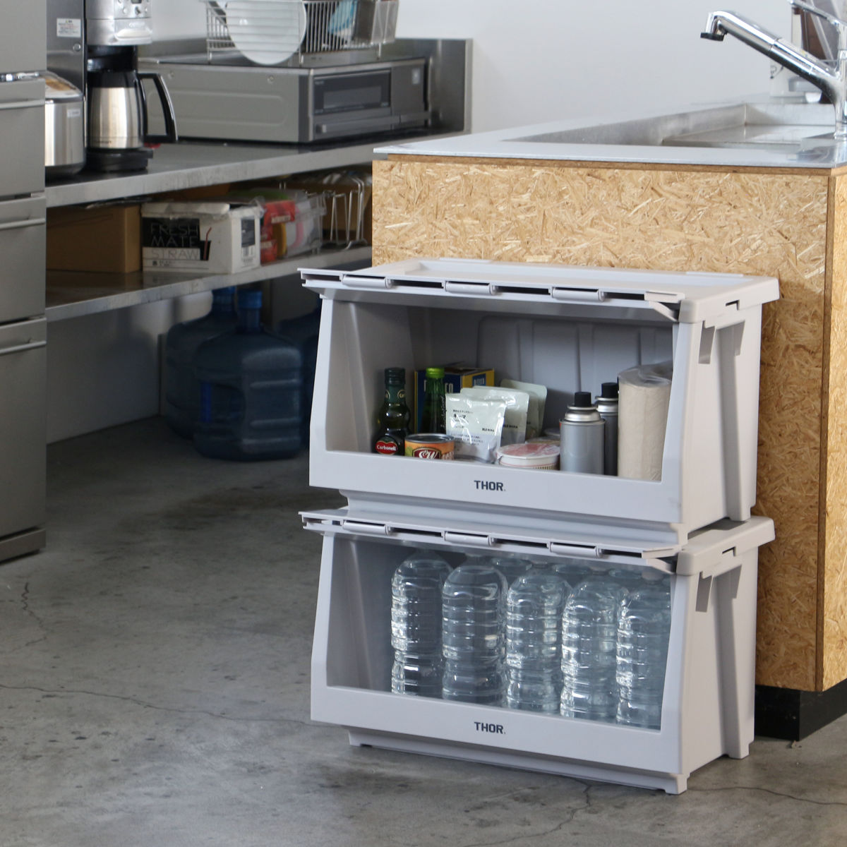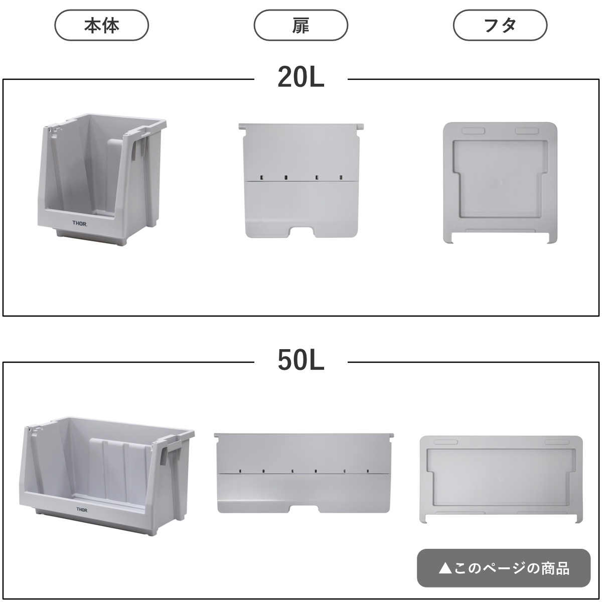 ●本体、蓋、扉を組み合わせて自分好みの棚を作ることができるTHORスタッキングシェルフコンテナ 50L 上蓋のみです。