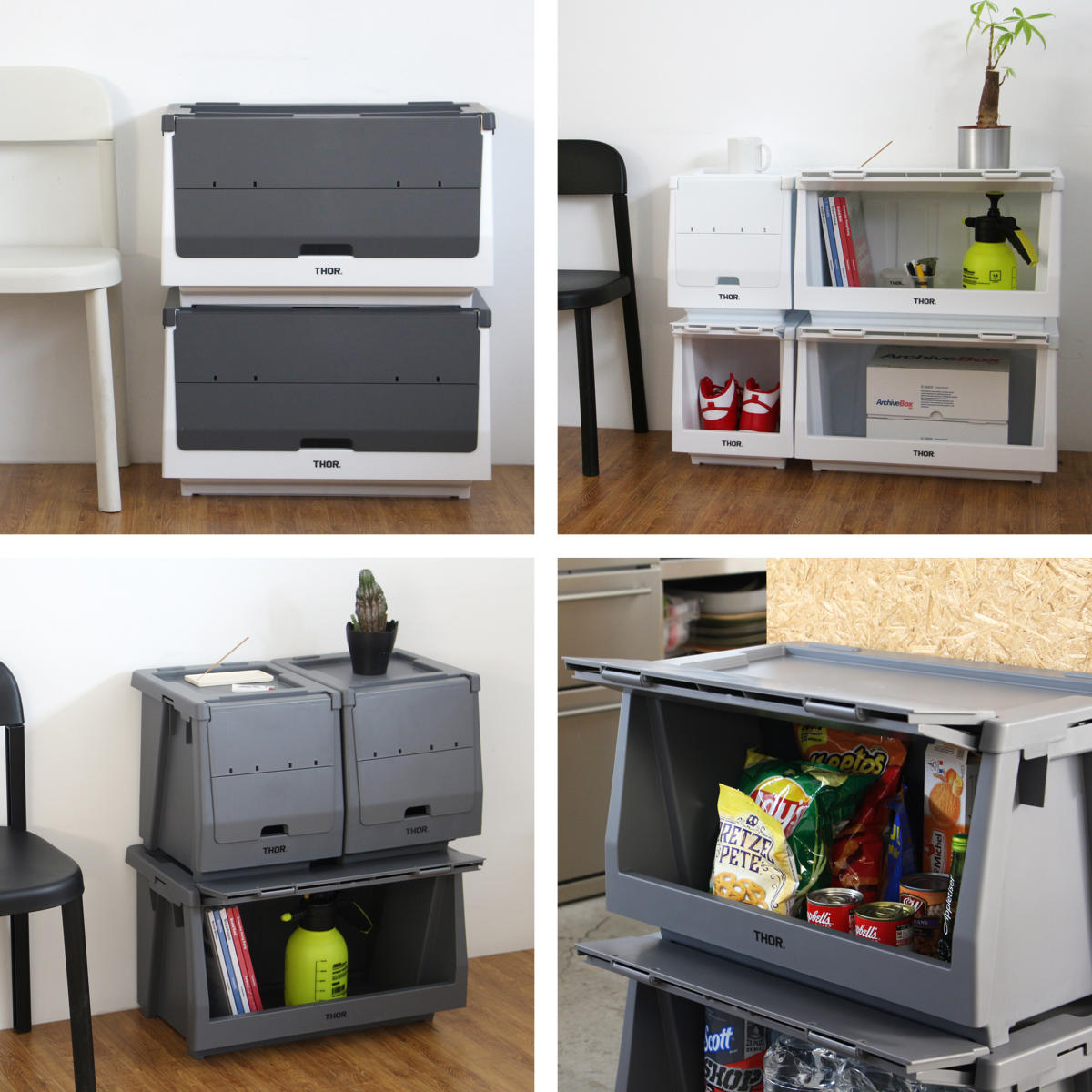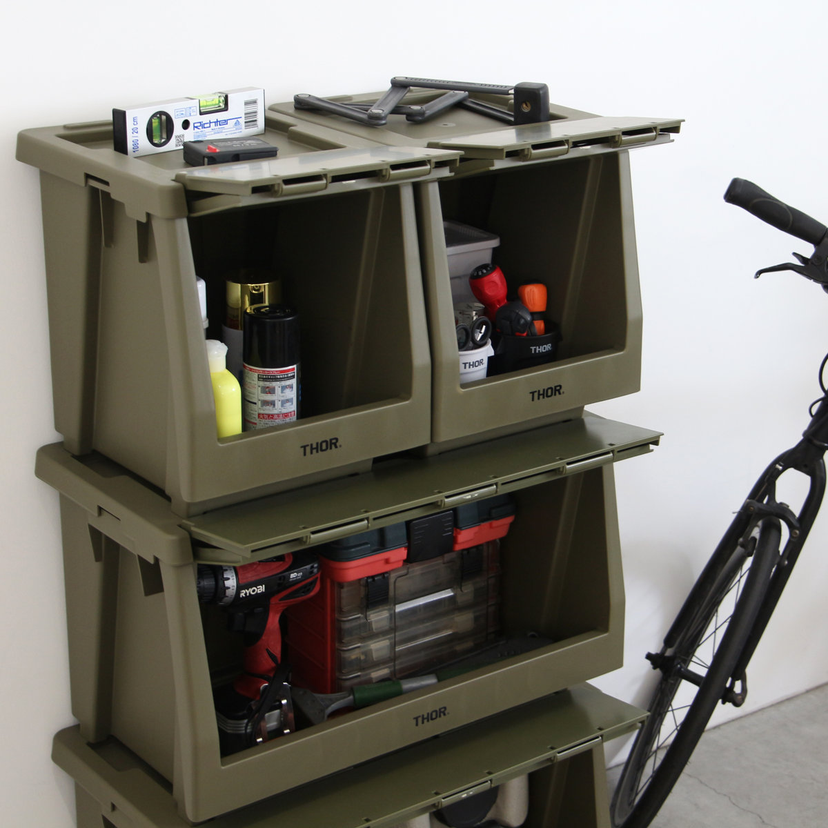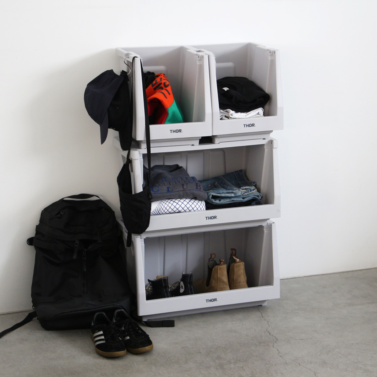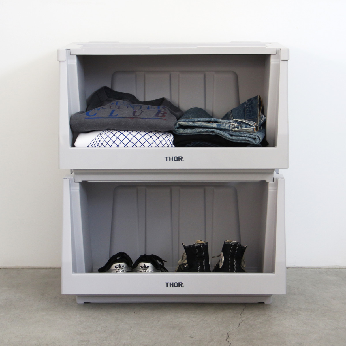 ●本体、蓋、扉を組み合わせて自分好みの棚を作ることができるTHORスタッキングシェルフコンテナ 50L 上蓋のみです。