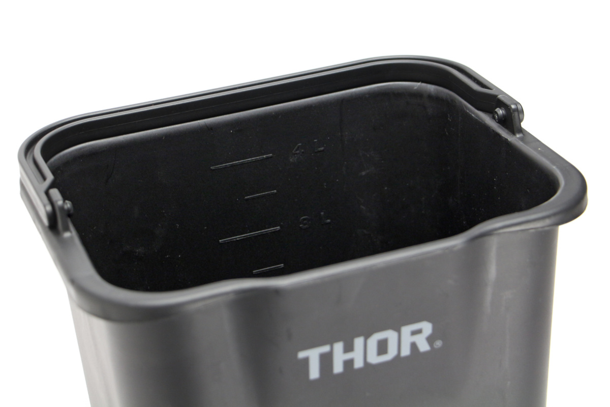 一辺には水を捨てやすい注ぎ口を設けた実用的な設計になっており、さらに1Lごとの目盛り付きで、洗剤の希釈や水量調整も簡単に行えます。業務用ならではの使いやすさが詰まっています。