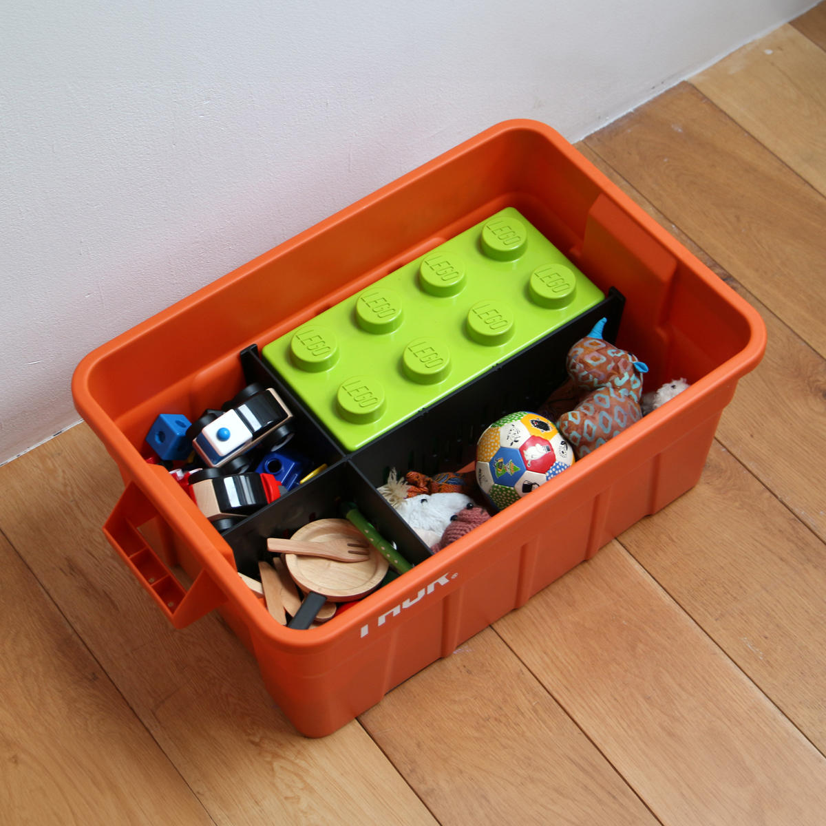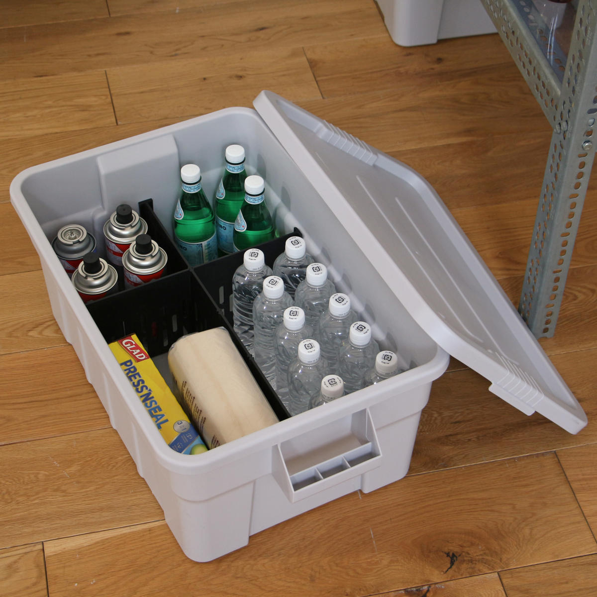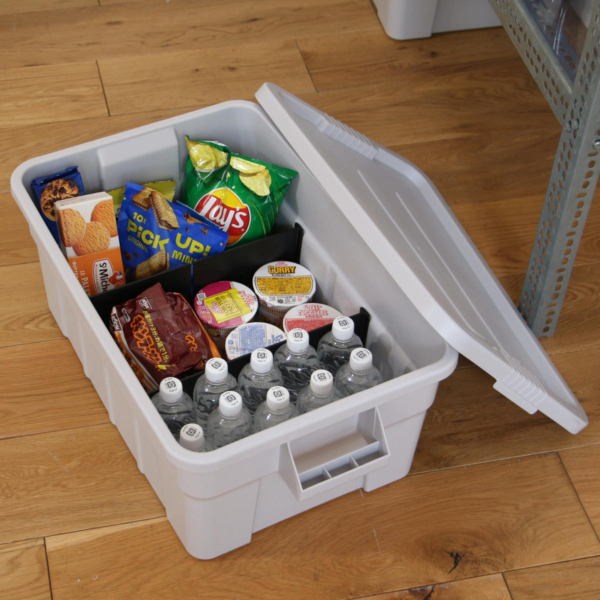 仕切り板を装着した上に別売り天板等を乗せることで、コンテナ内上部にもスペースを作ることができ、コンテナ収納をさらに有効的に使用することができます。