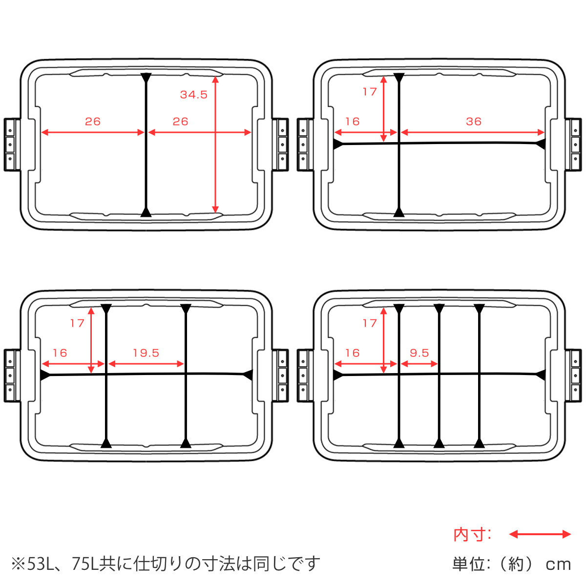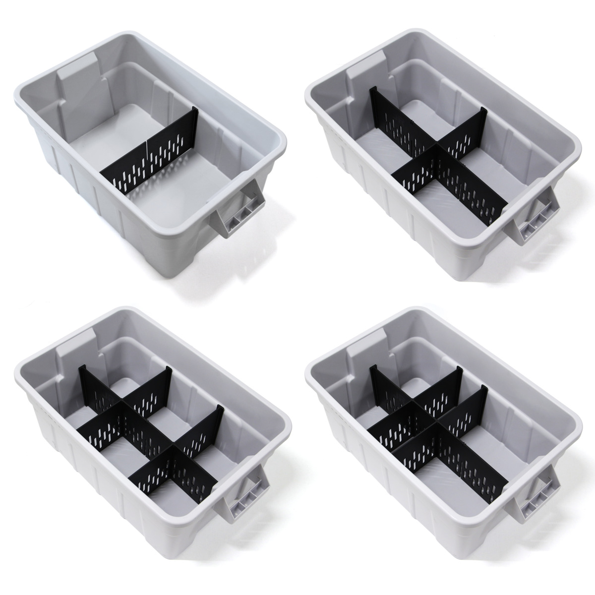 ショートタイプとロングタイプの2種類があります。ショートタイプはコンテナ内部の凹み部分に差し込むことで固定され、最大3ヶ所に装着することができます。ショートタイプを差し込み後、ロングタイプを差し込むことで更に分割することができます。