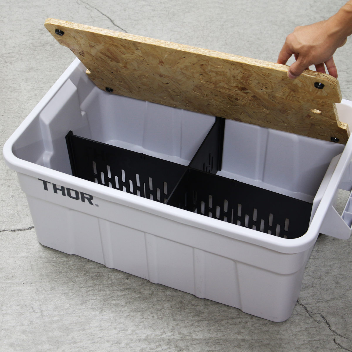 THORラージトートの53Lコンテナ内に差し込むことで使用できる専用仕切り板です。THORラージトートの収納用途をより広げ、大切な道具や小物をすっきりと収納することができます。