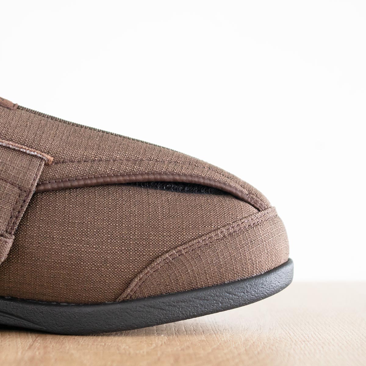 トゥボックスが高く、つま先にゆとりを持たせた構造のシューズです。履き口が大きく開くため、介助者にとっても履かせやすいです。足指が折れ曲がっていないか等、つま先の状態を確認しながら足入れできます。