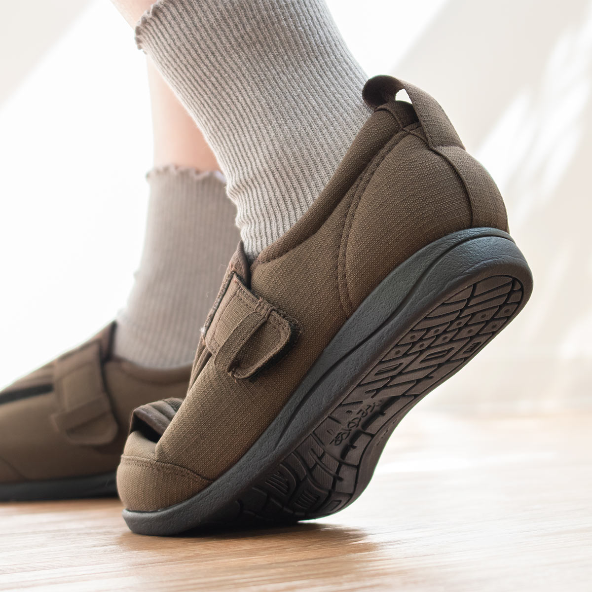 足囲・足幅がゆったりした5Eサイズなので、履いていて楽です。かかとがあるのでデイサービスでのご利用や入院時の上履きにも可能です。