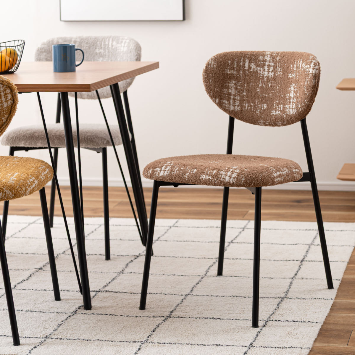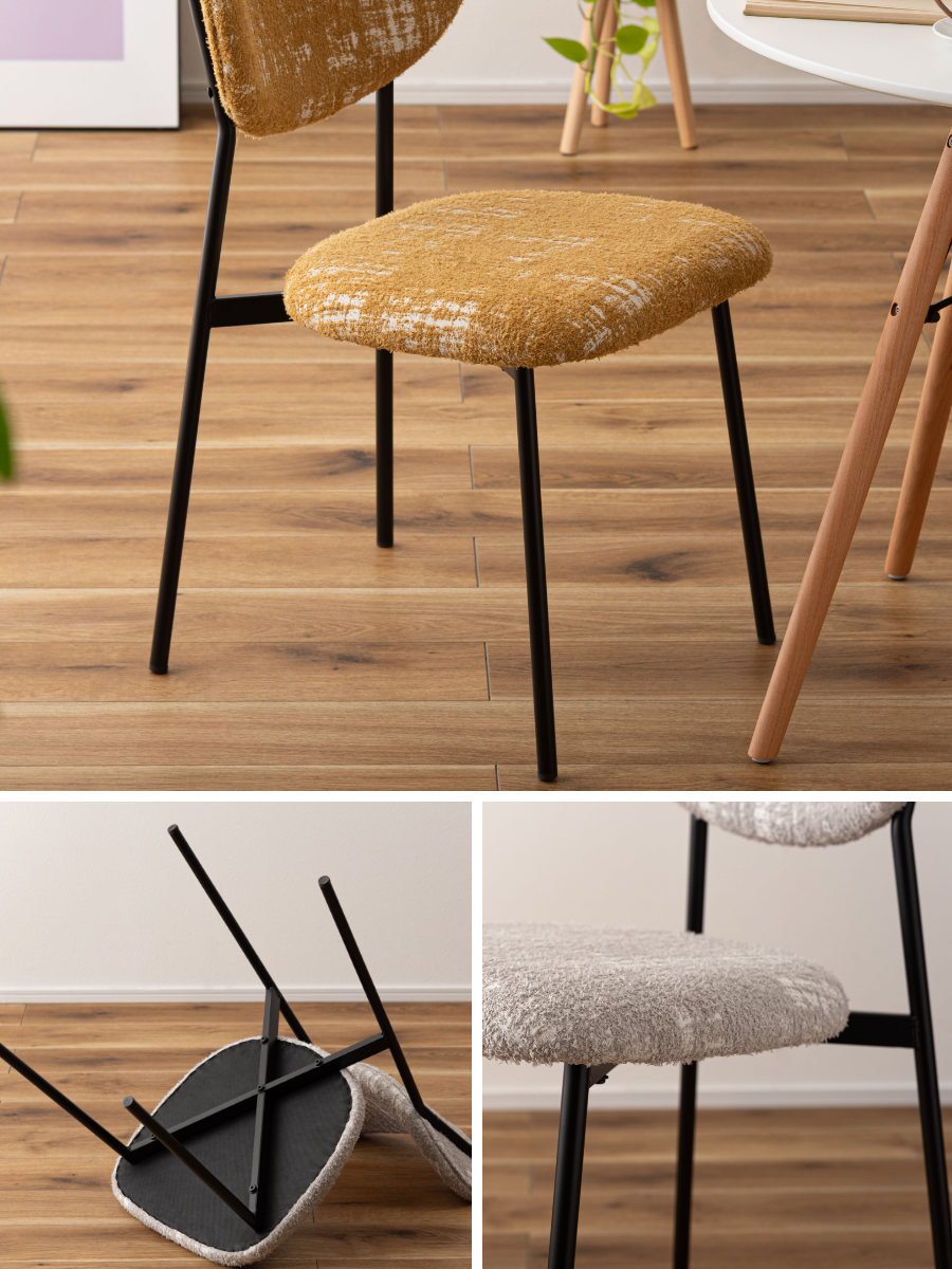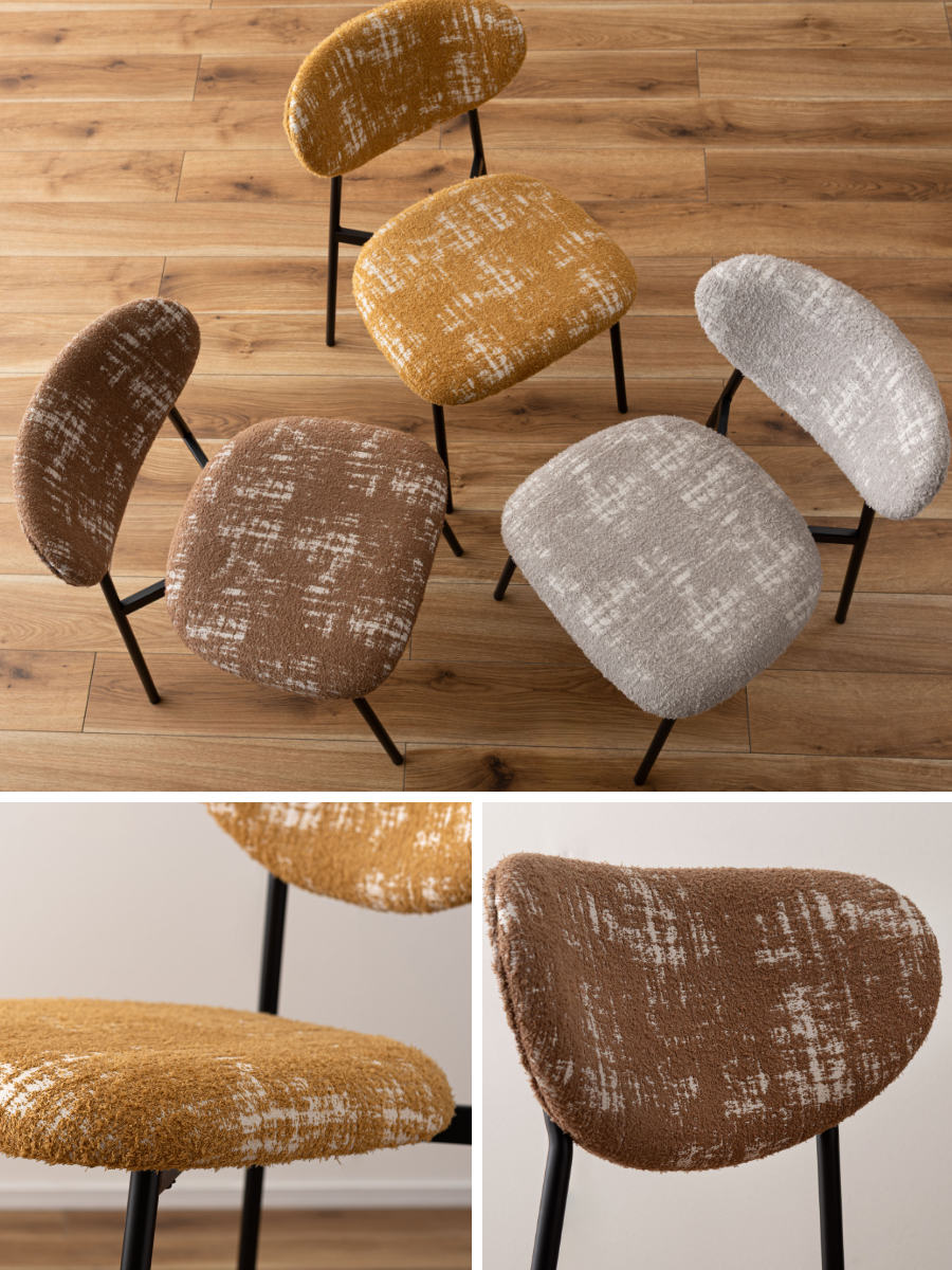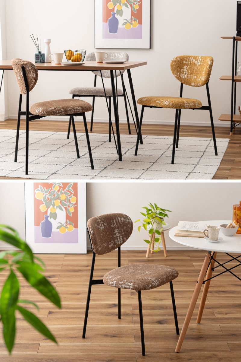 空間に個性と表情を添えるダイニングチェア。丸みのあるフォルムと特徴的な素材がどこか懐かしさを感じさせ、細身のブラックスチール脚が全体をすっきりと引き締めます。レトロさと現代的な軽やかさが調和した一脚です。