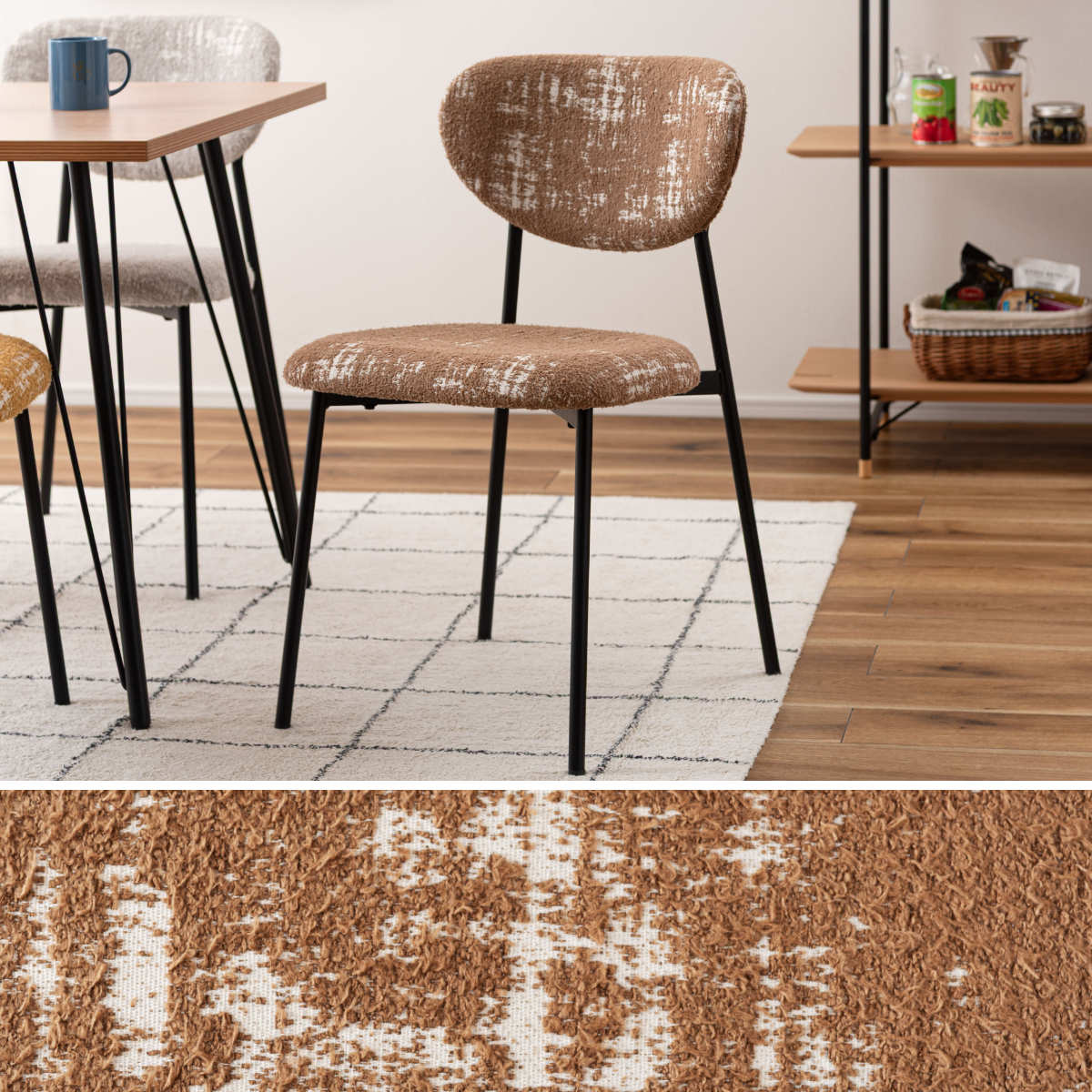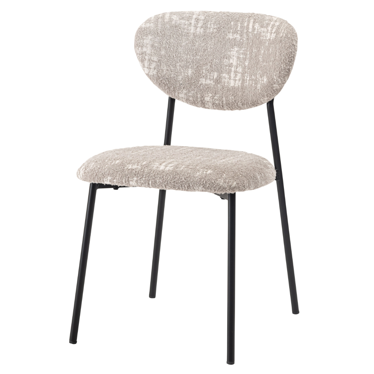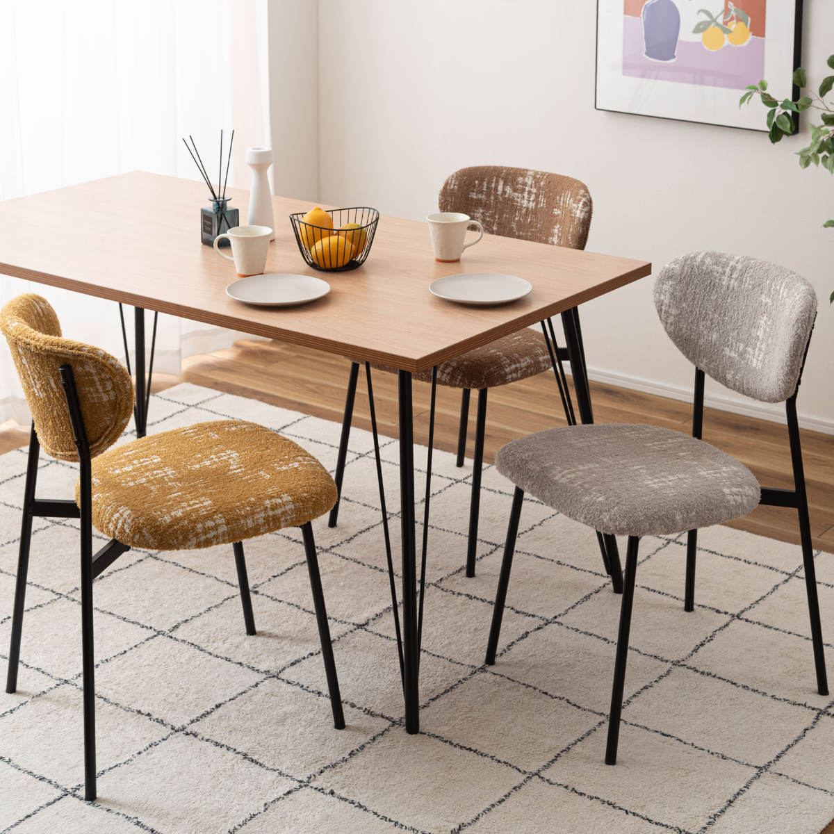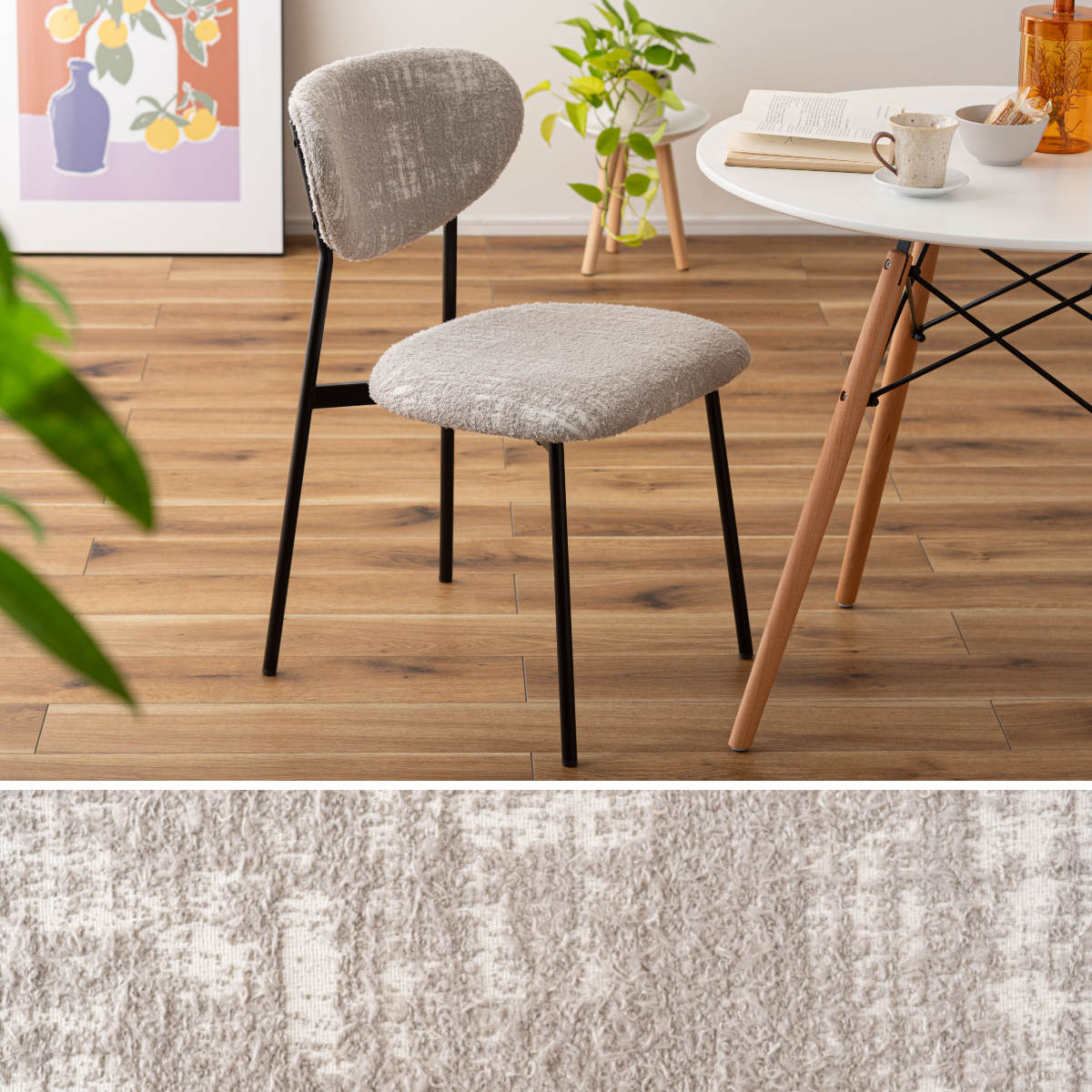 空間に個性と表情を添えるダイニングチェア。丸みのあるフォルムと特徴的な素材がどこか懐かしさを感じさせ、細身のブラックスチール脚が全体をすっきりと引き締めます。レトロさと現代的な軽やかさが調和した一脚です。