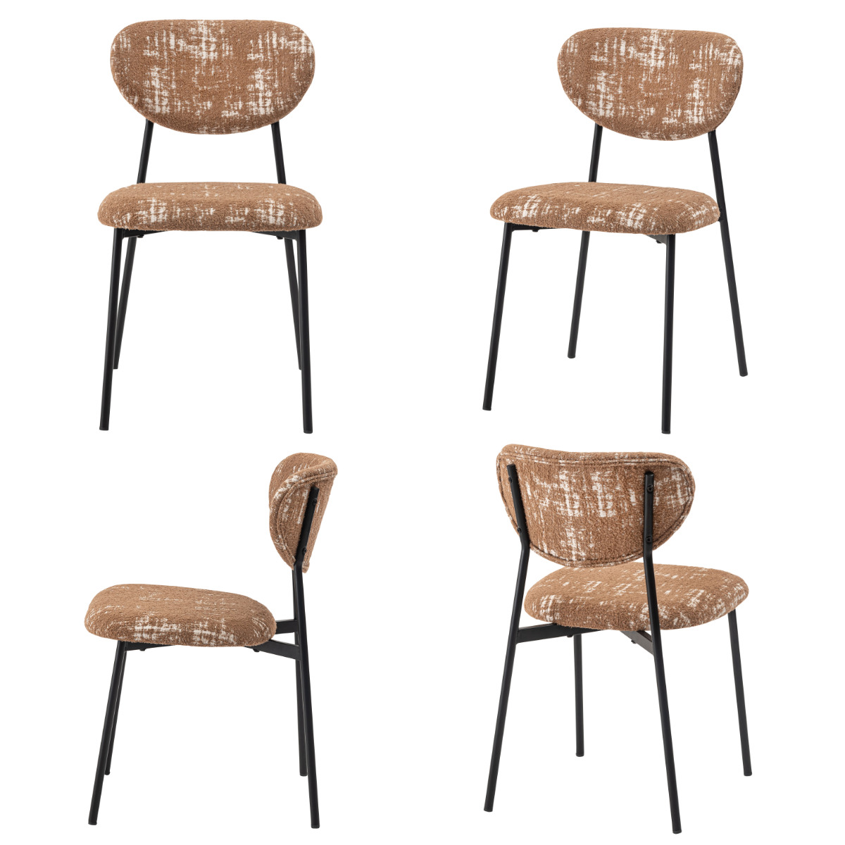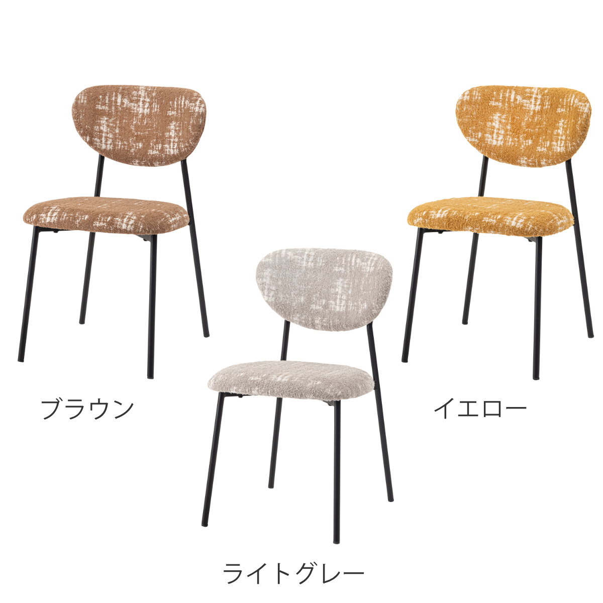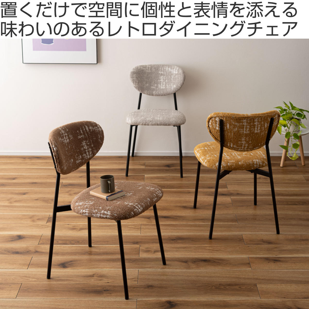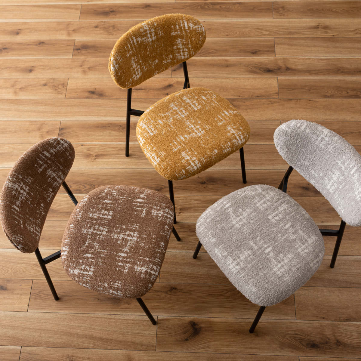 空間に個性と表情を添えるダイニングチェア。丸みのあるフォルムと特徴的な素材がどこか懐かしさを感じさせ、細身のブラックスチール脚が全体をすっきりと引き締めます。レトロさと現代的な軽やかさが調和した一脚です。