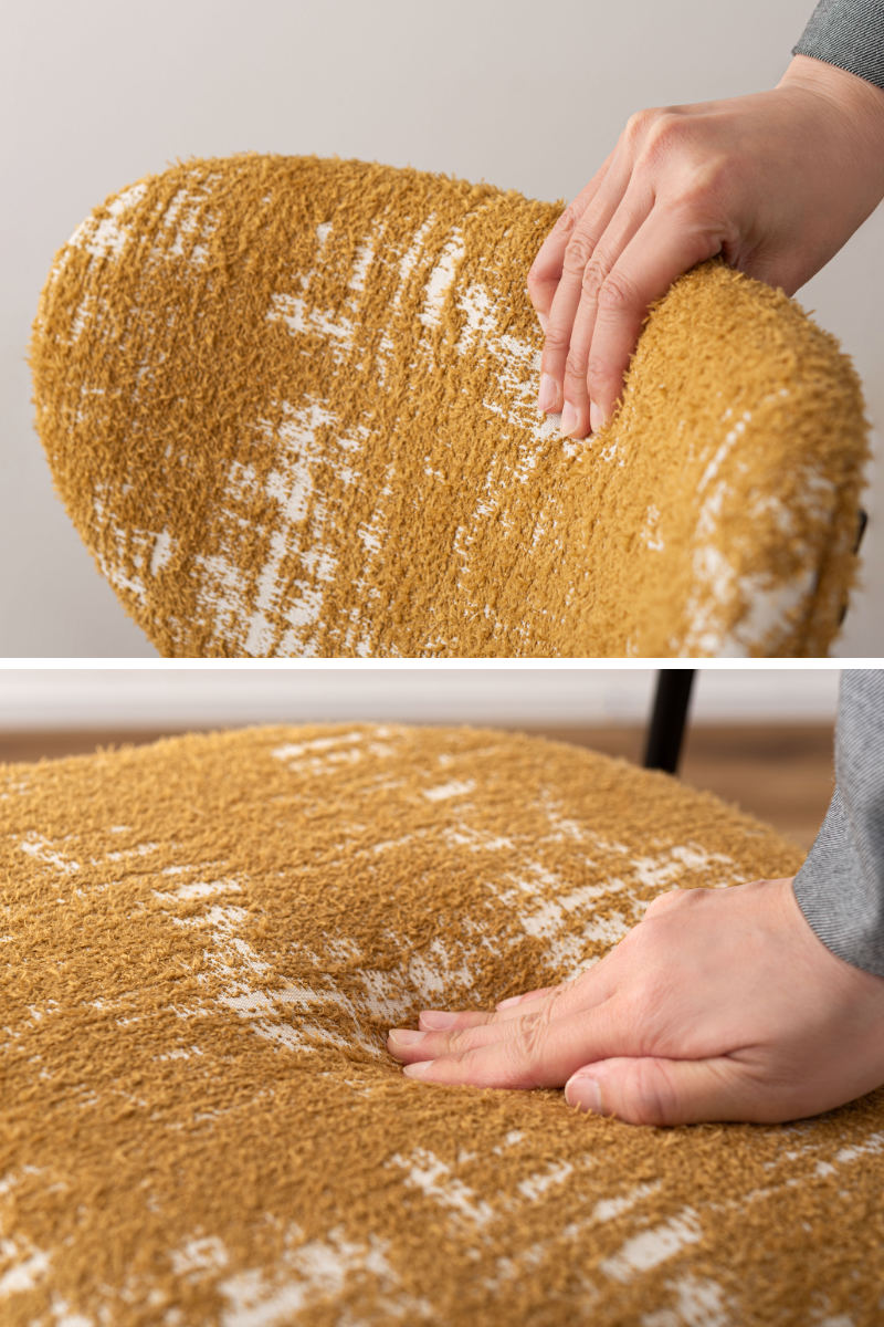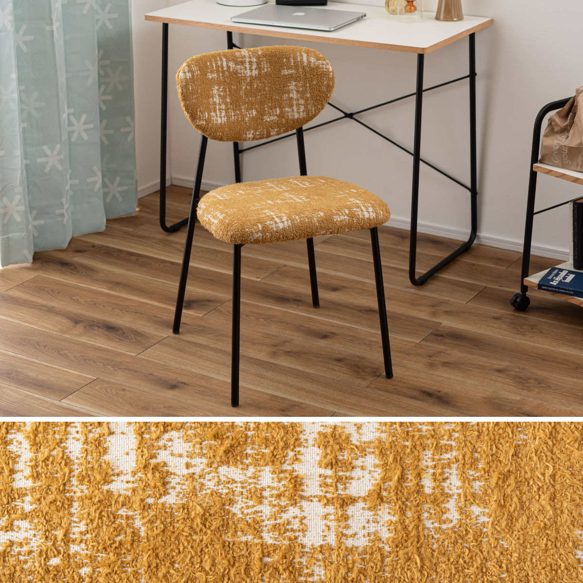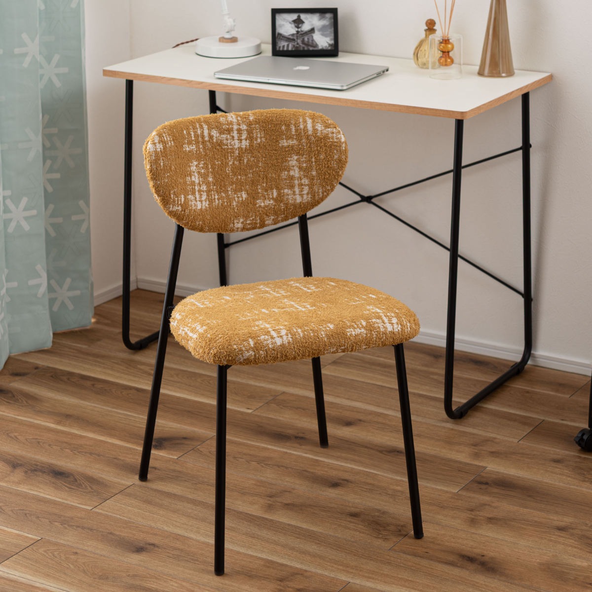 脚部は細身のブラックスチール脚を採用。全体をスタイリッシュに引き締め、レトロなファブリックとのバランスを整えます。安定感がありながら、圧迫感を与えにくいデザインです。