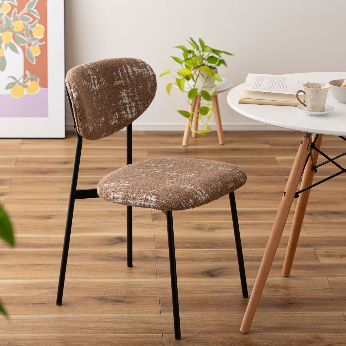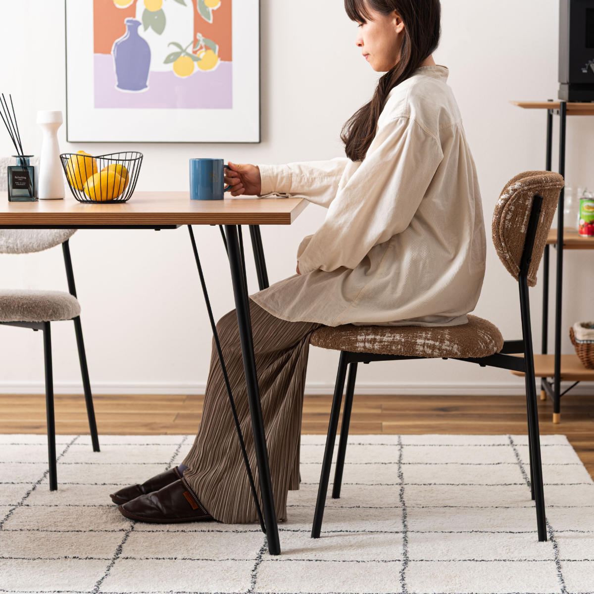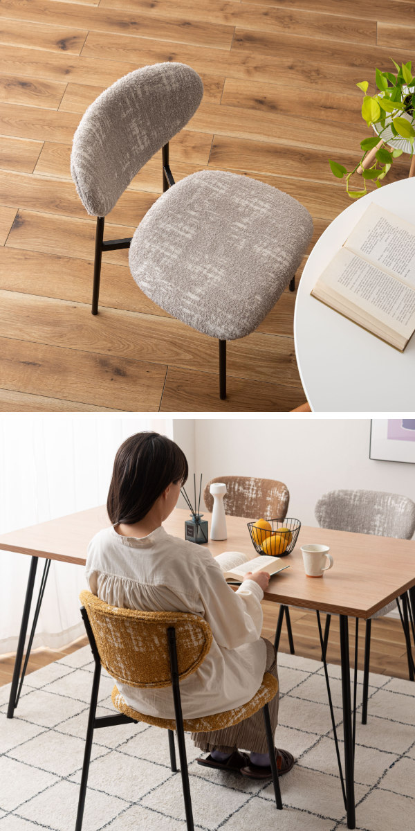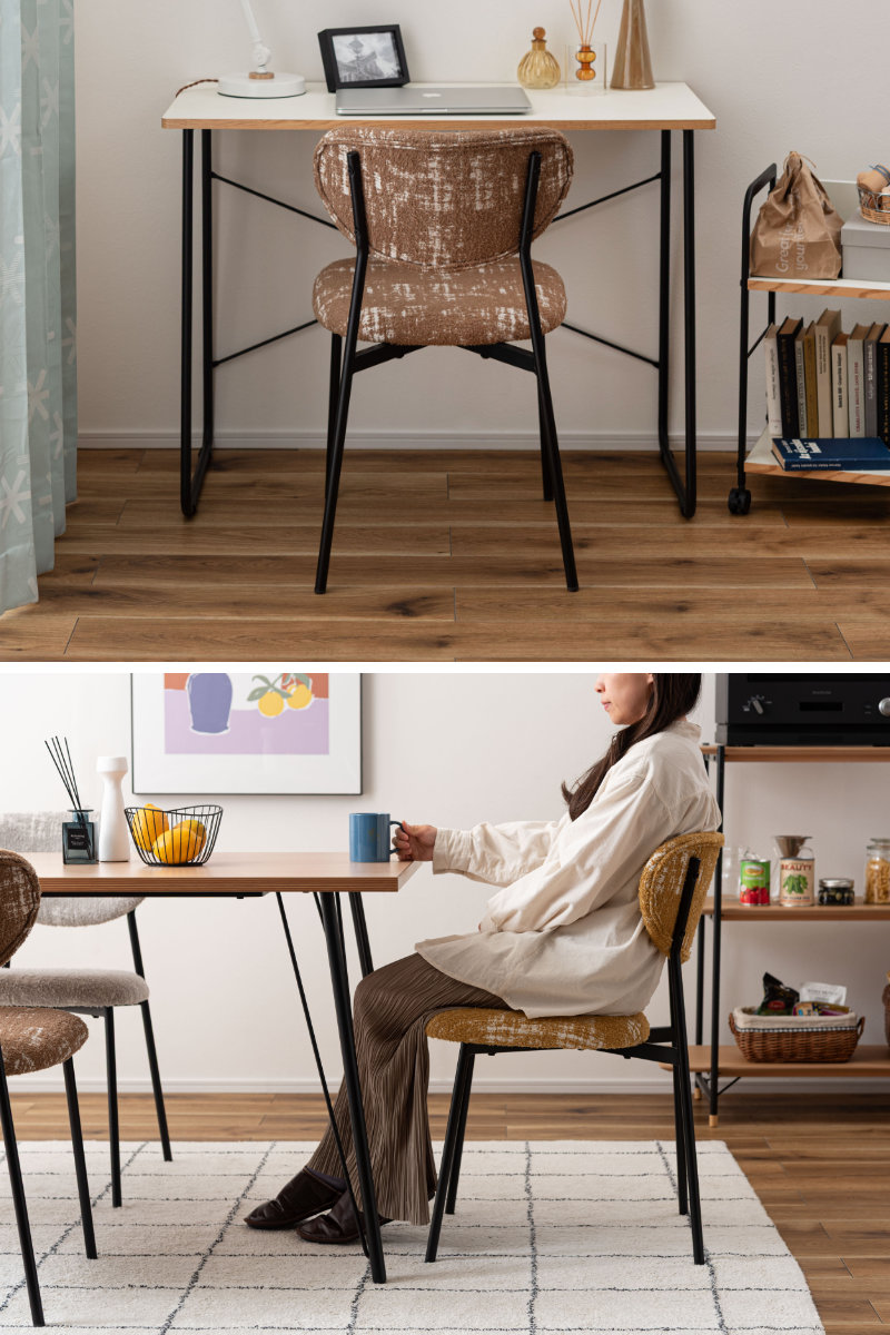 ダイニングチェアとしてはもちろん、デスクチェアとしても活躍します。朝のコーヒータイムや、ゆったりと読書を楽しむひとときにも心地よく寄り添う一脚。いつもの部屋に、カフェのようなおしゃれで心地よい雰囲気をプラスしてくれます。