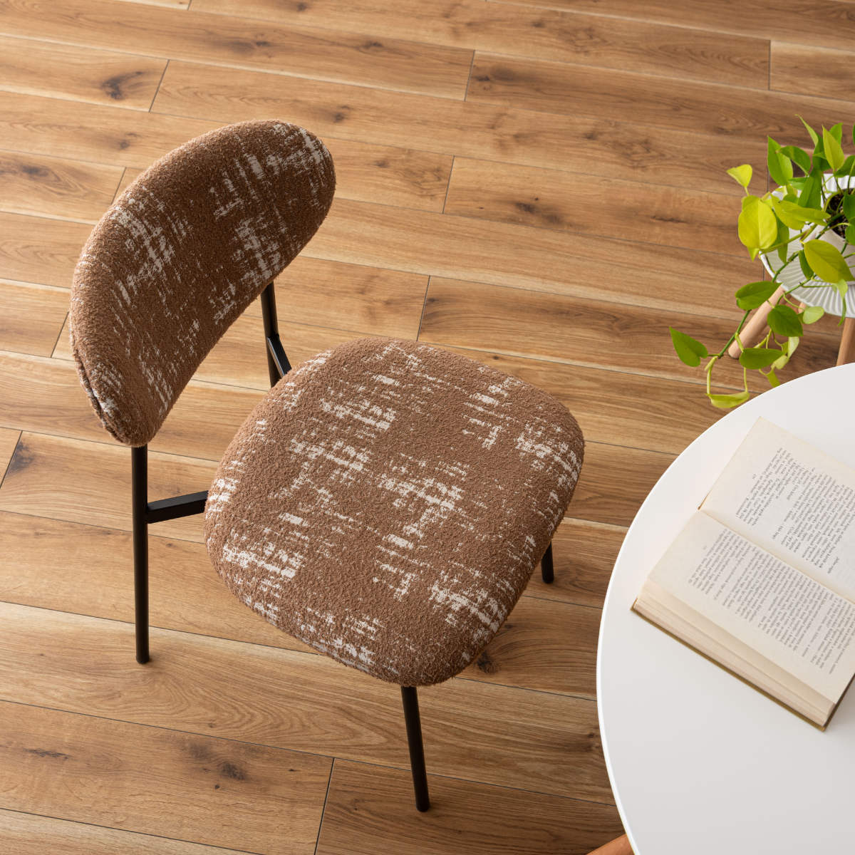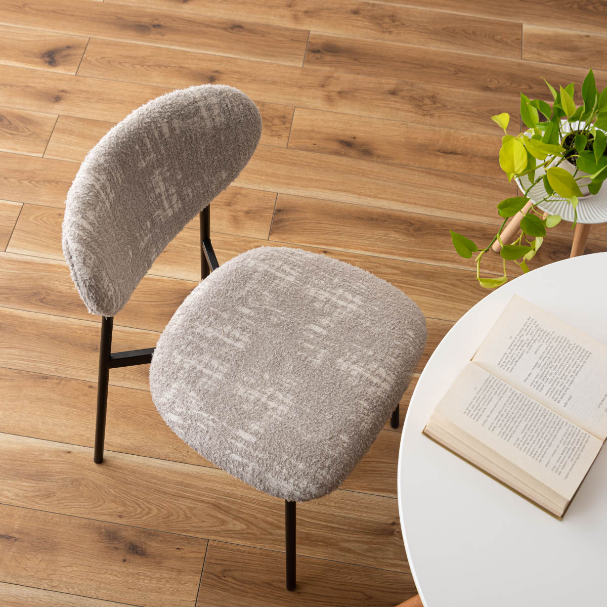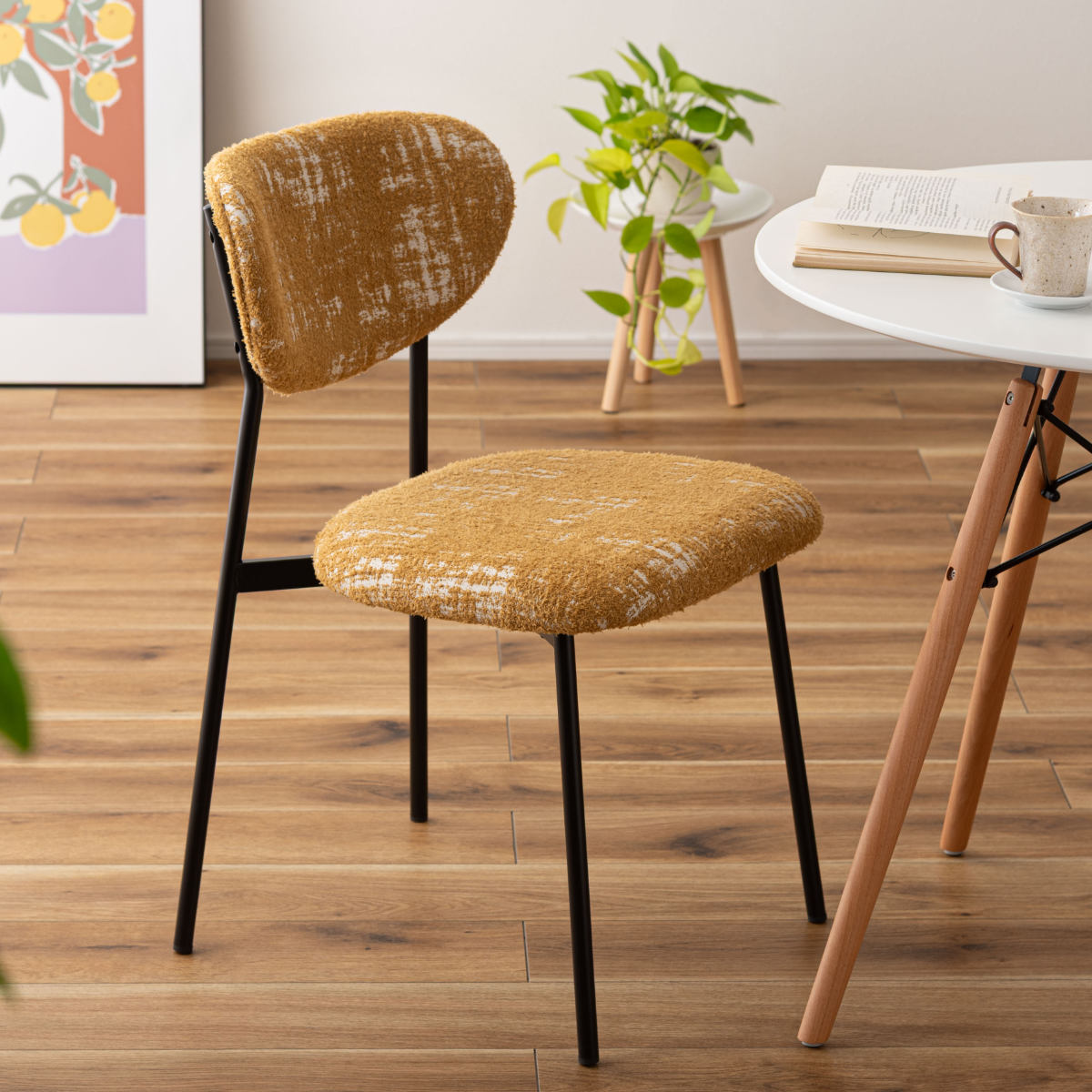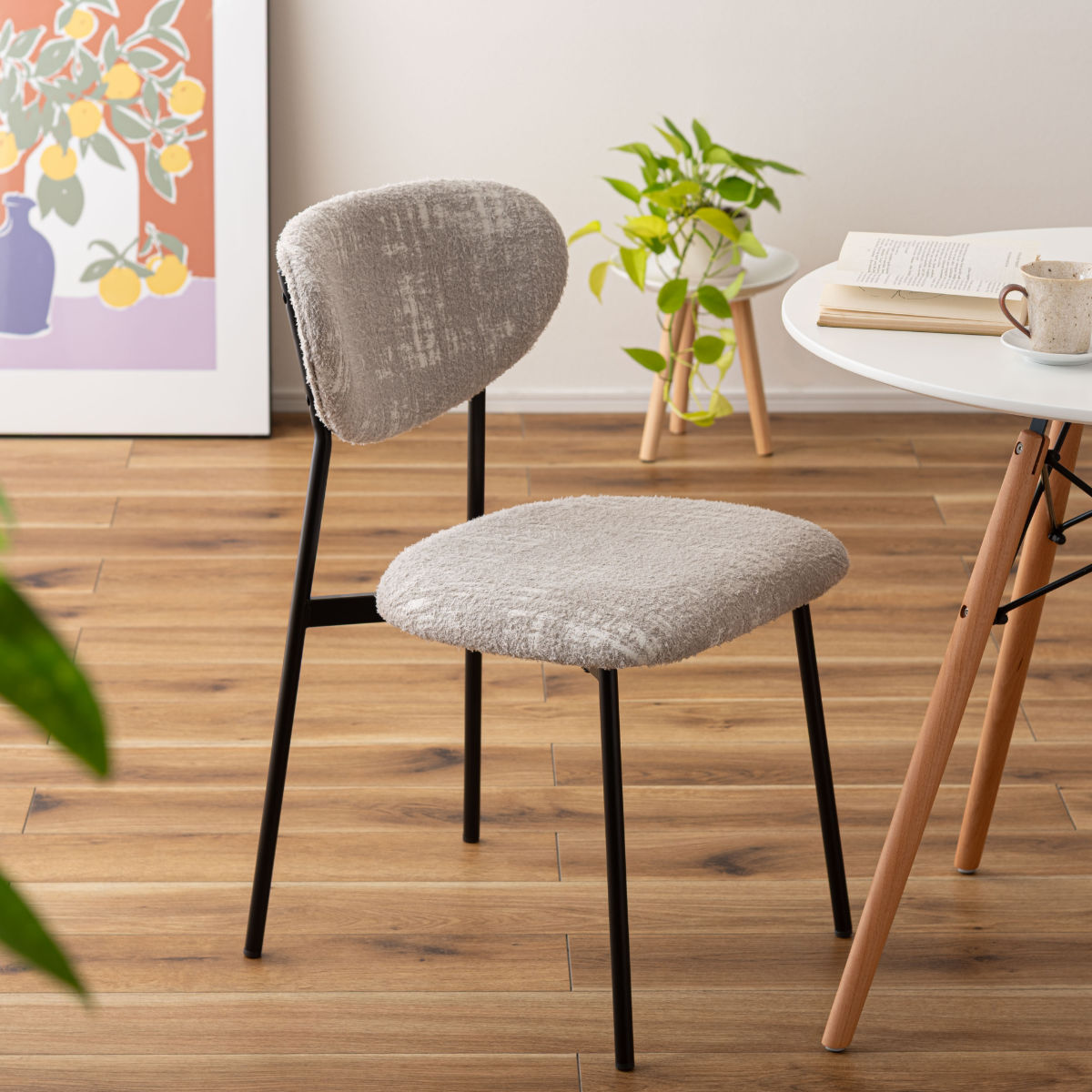 ダイニングチェアとしてはもちろん、デスクチェアとしても活躍します。朝のコーヒータイムや、ゆったりと読書を楽しむひとときにも心地よく寄り添う一脚。いつもの部屋に、カフェのようなおしゃれで心地よい雰囲気をプラスしてくれます。