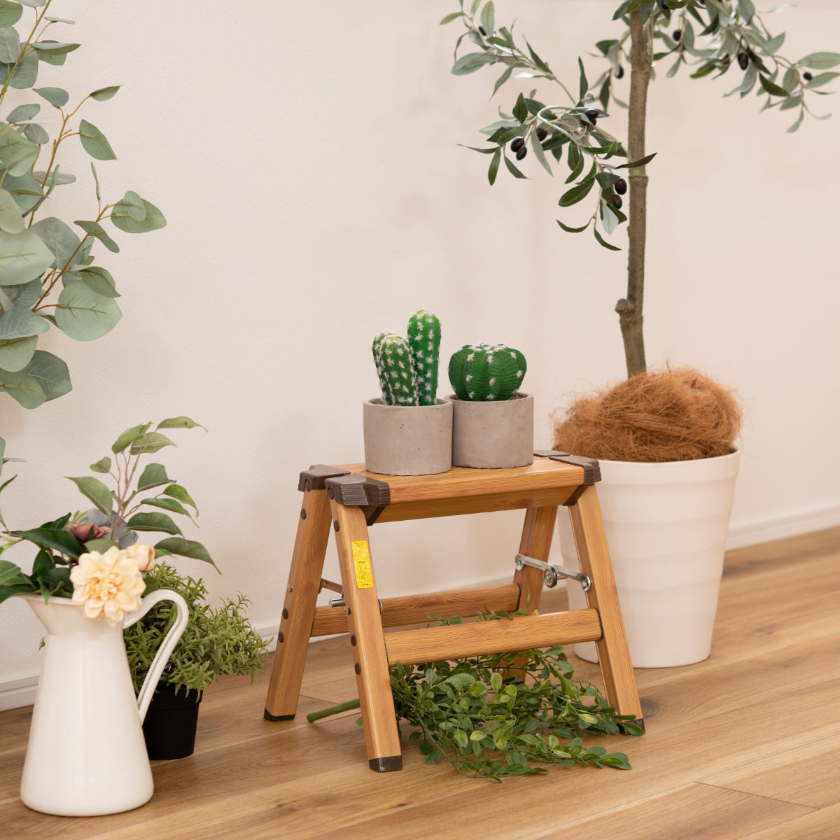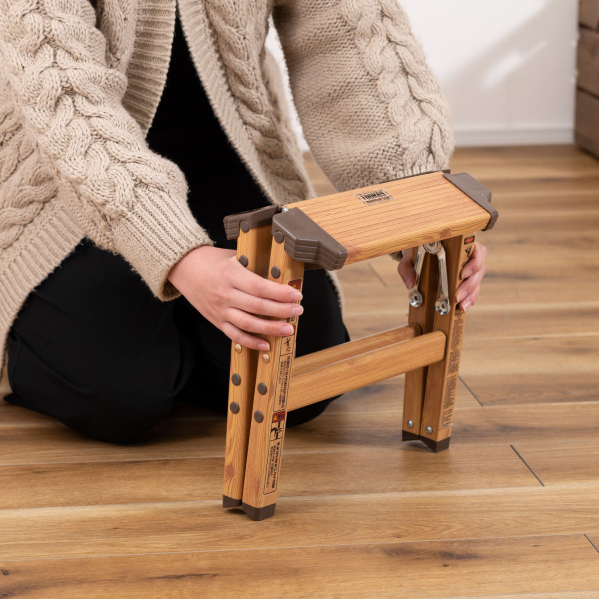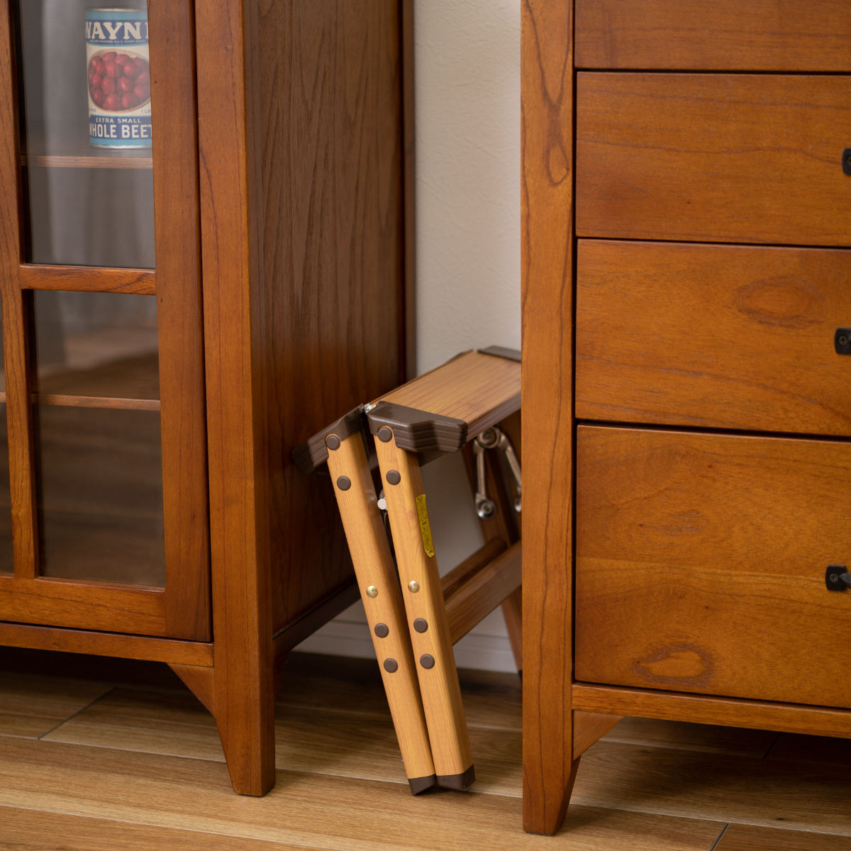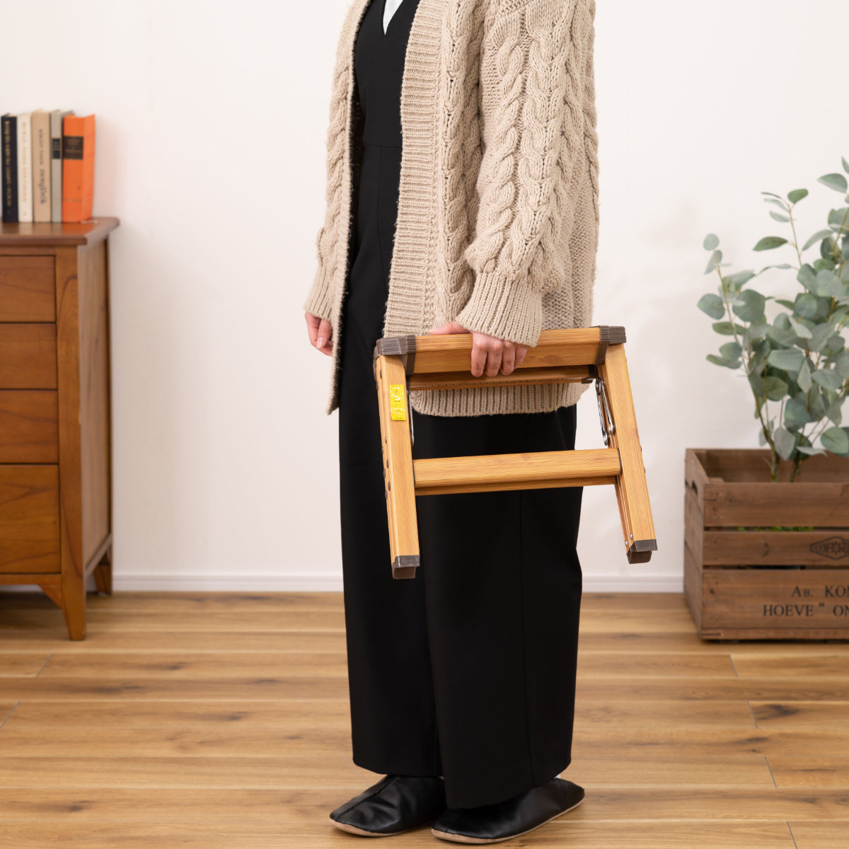 アルミ製で軽く扱いやすいのに、見た目はあたたかみのある木目調仕上げのスツールです。無機質になりがちな脚立の印象をやわらげ、インテリアにも自然になじむデザインです。