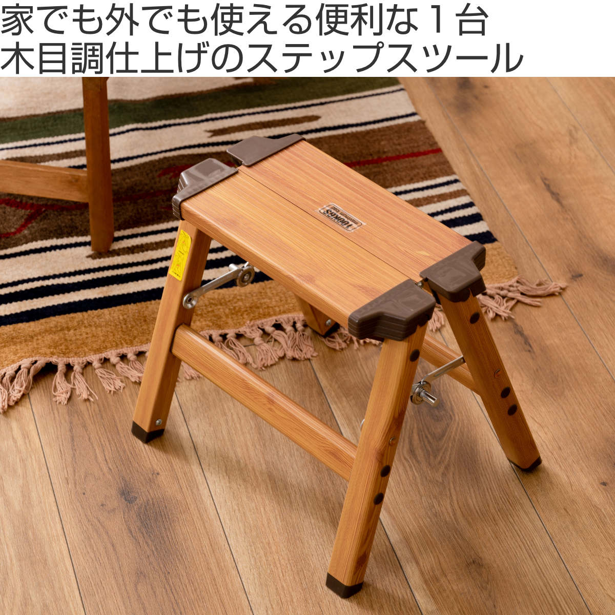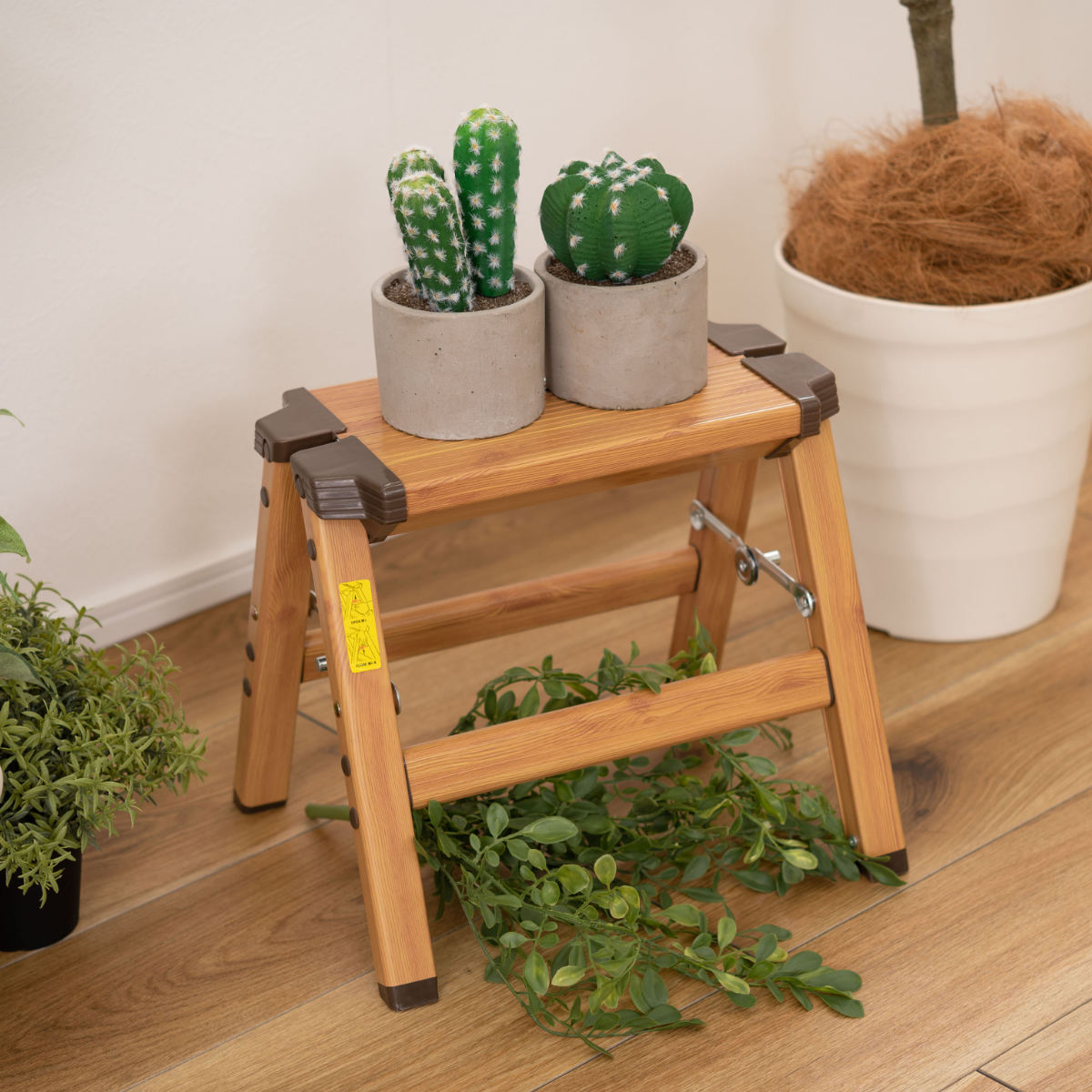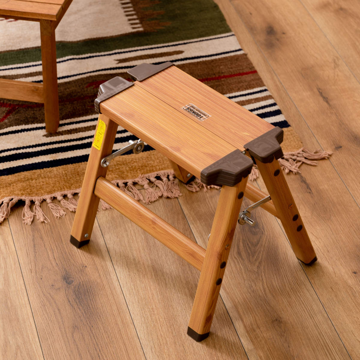 アルミ製で軽く扱いやすいのに、見た目はあたたかみのある木目調仕上げのスツールです。無機質になりがちな脚立の印象をやわらげ、インテリアにも自然になじむデザインです。