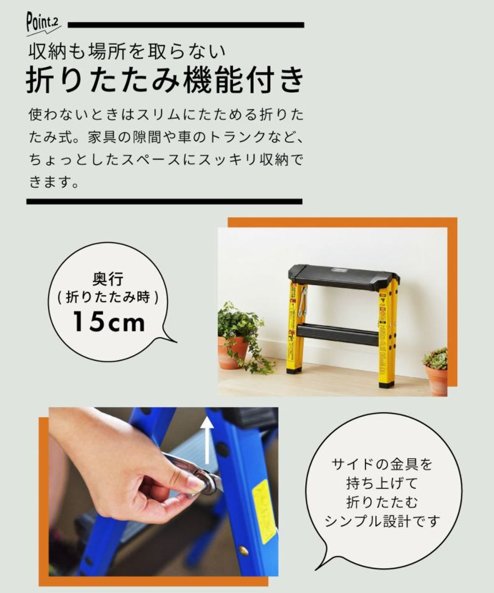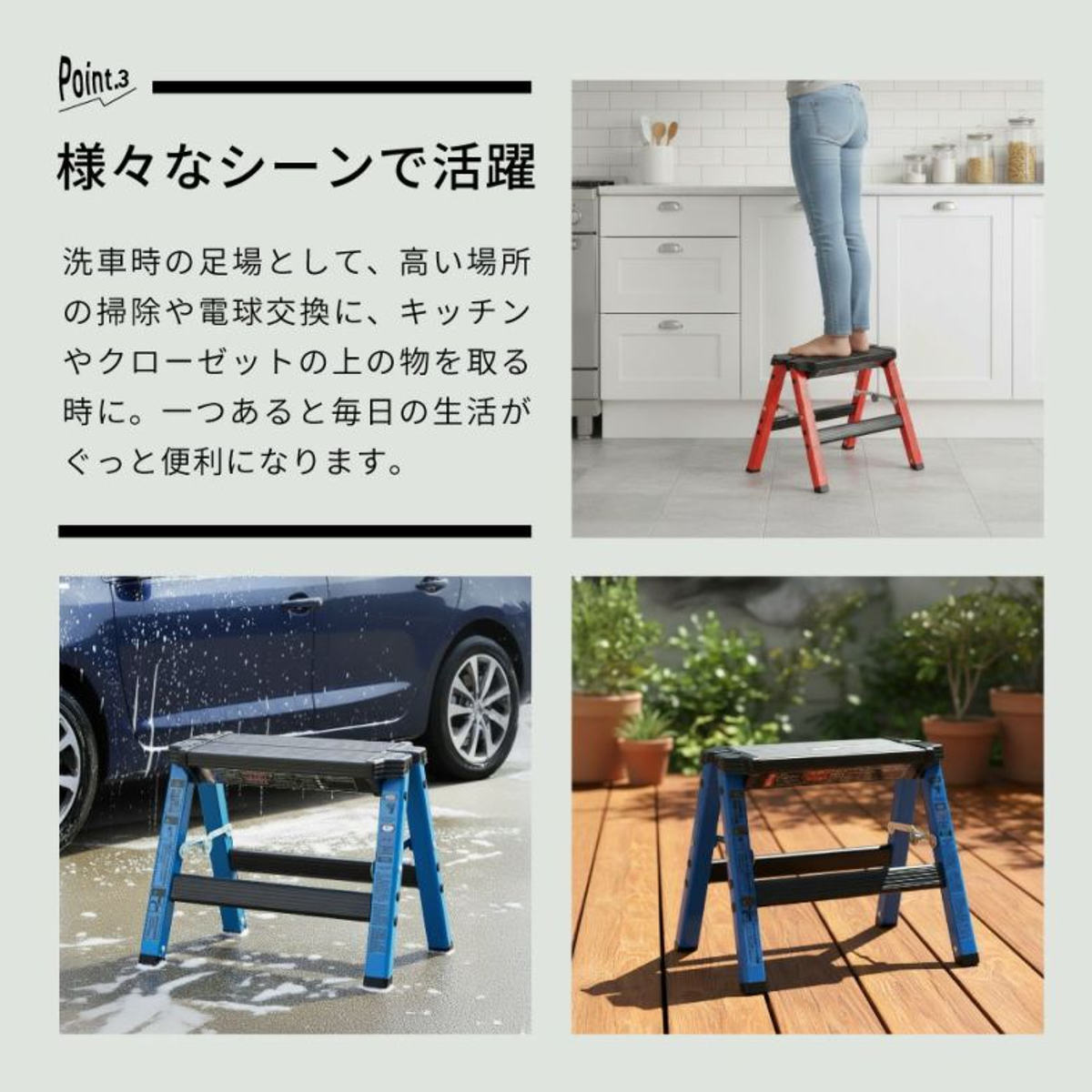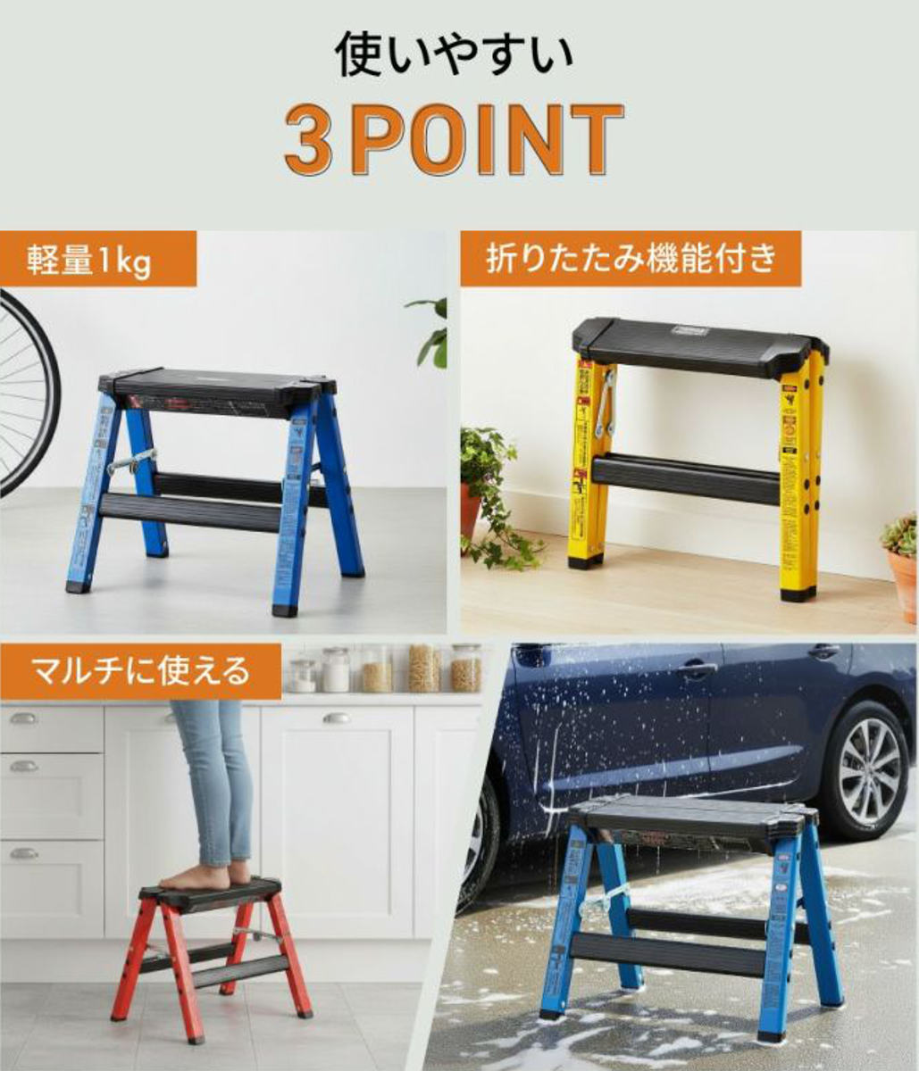 洗車時の足場としてはもちろん、高い場所の掃除や電球交換、キッチンやクローゼット上部の収納物を取る際にも活躍。一台あると、毎日の暮らしがぐっと快適になります。