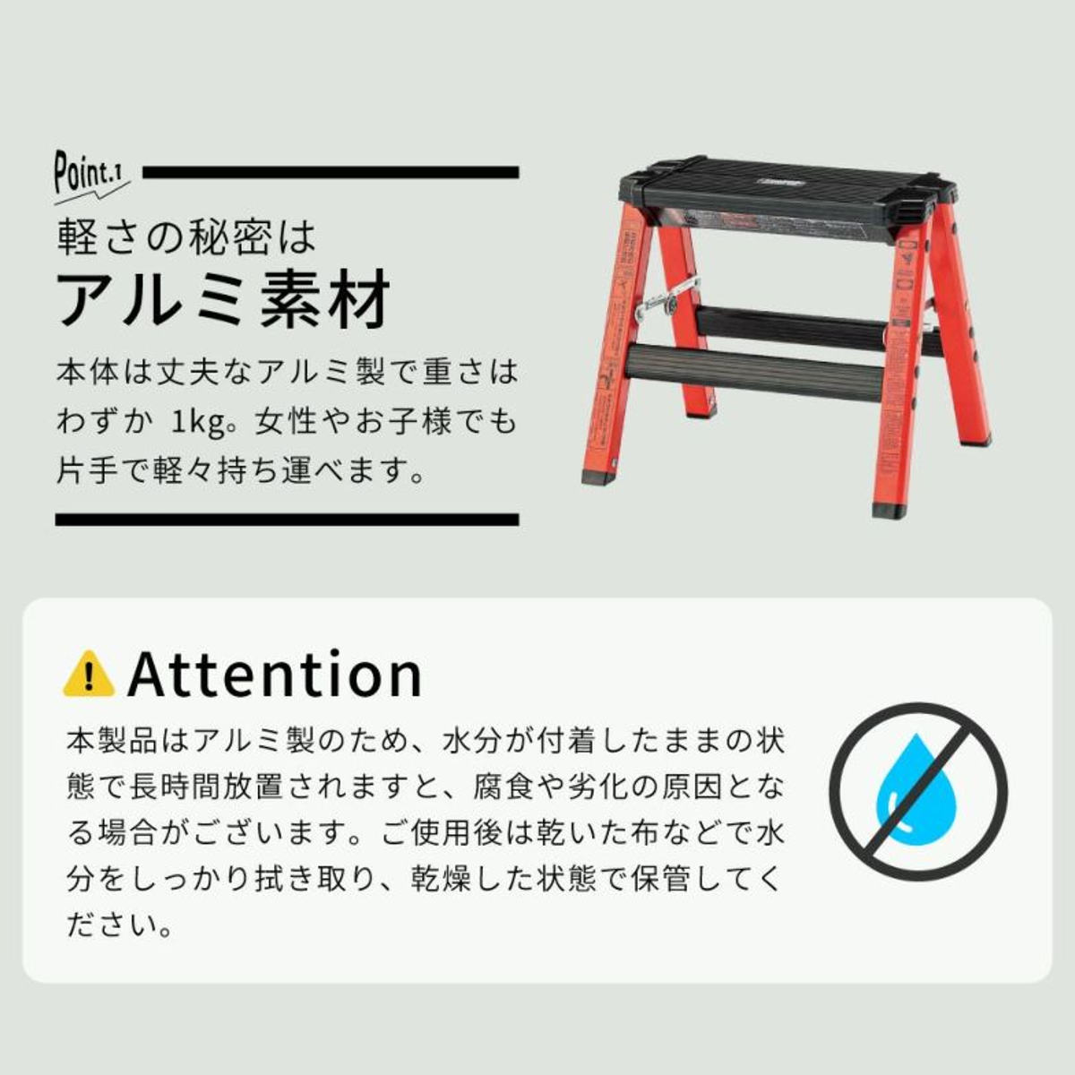 ※本製品はアルミ製のため、水分が付着した状態で長時間放置すると、腐食や劣化の原因となる場合があります。ご使用後は乾いた布で水分を拭き取り、乾燥した状態で保管してください。