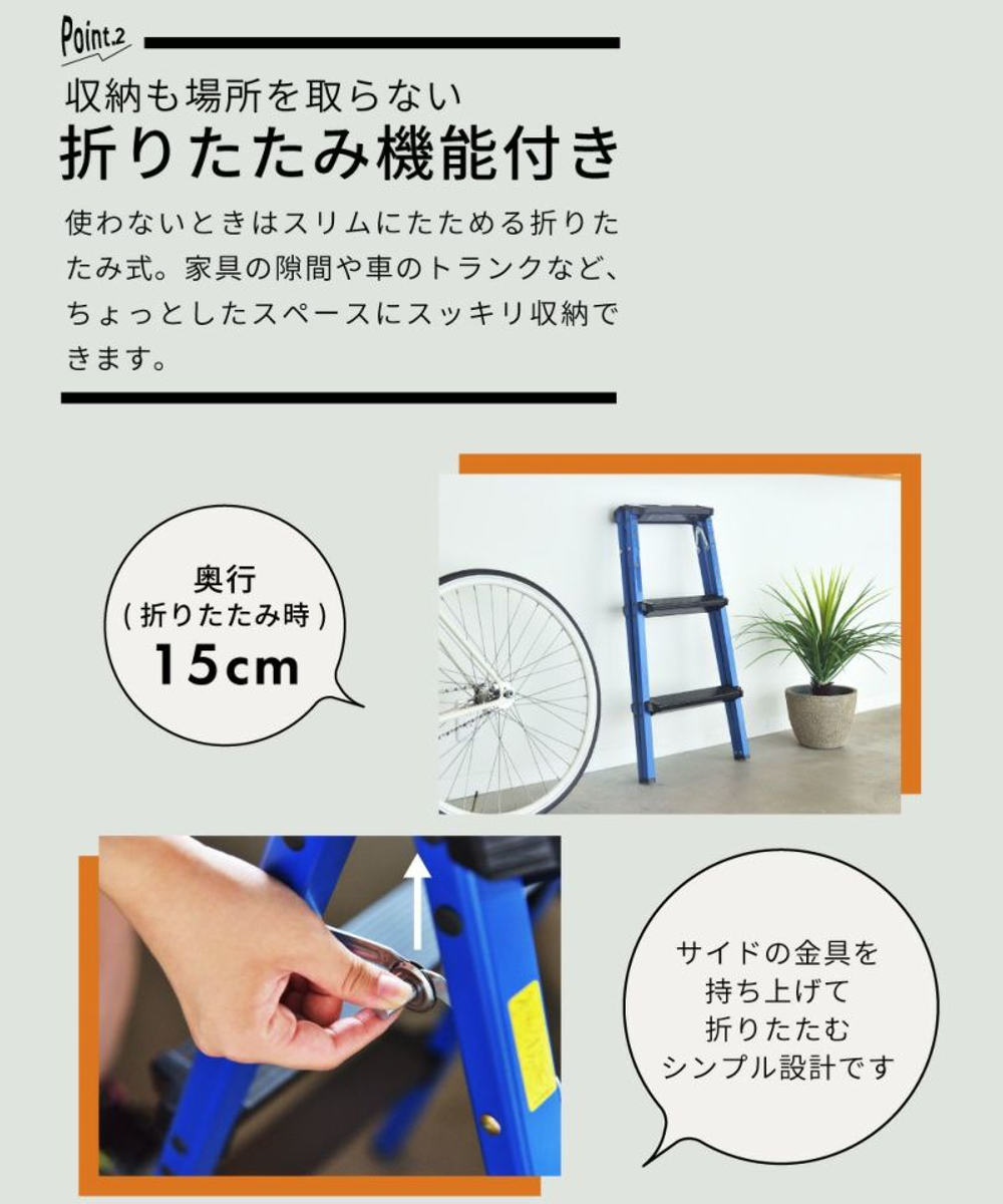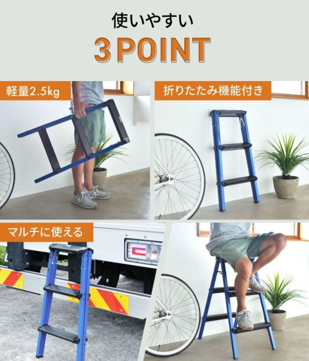 洗車時の足場としてはもちろん、高い場所の掃除や電球交換、キッチンやクローゼット上部の収納物を取る際にも活躍。一台あると、毎日の暮らしがぐっと快適になります。