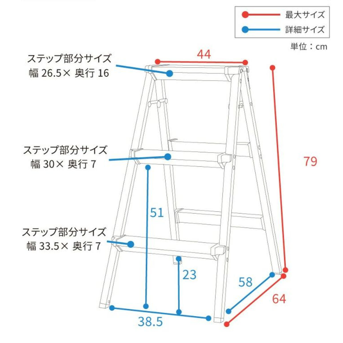 | サイズ | 約 幅44×奥行64×高さ79(cm) ステップサイズ 上段:約 幅26.5×奥行16cm 中段:約 幅30×奥行7cm 下段:約 幅33.5×奥行7cm |