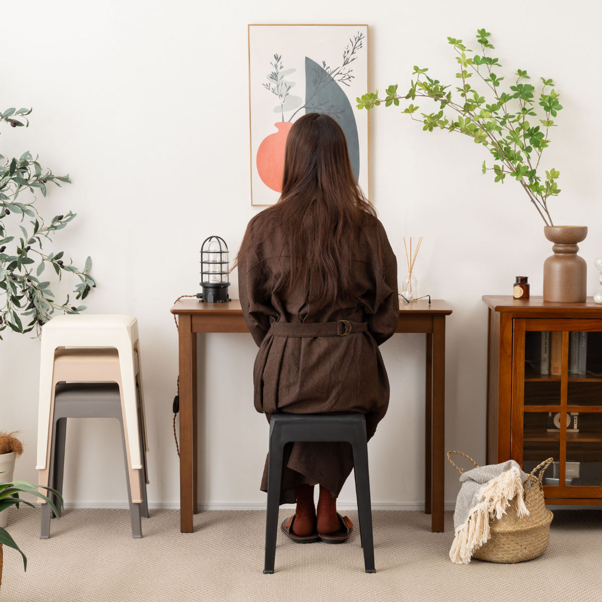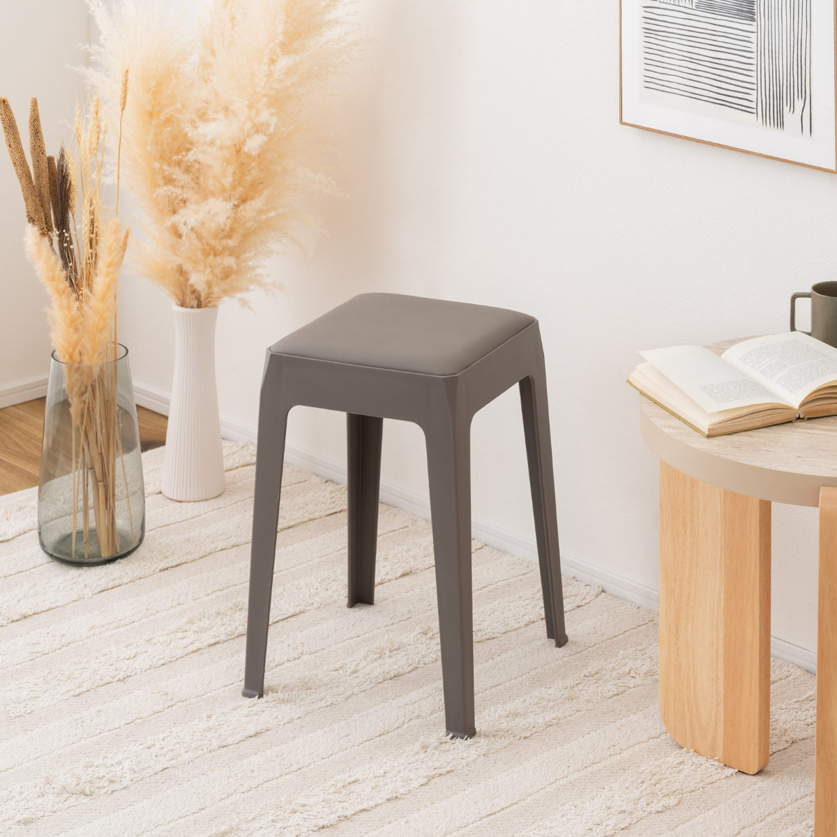 くすみ感のあるやわらかなカラーと、無駄のないシンプルなフォルムのスツールです。主張しすぎず、さりげなく空間を引き立てます。ナチュラルにもモダンにも合わせやすい一脚です。