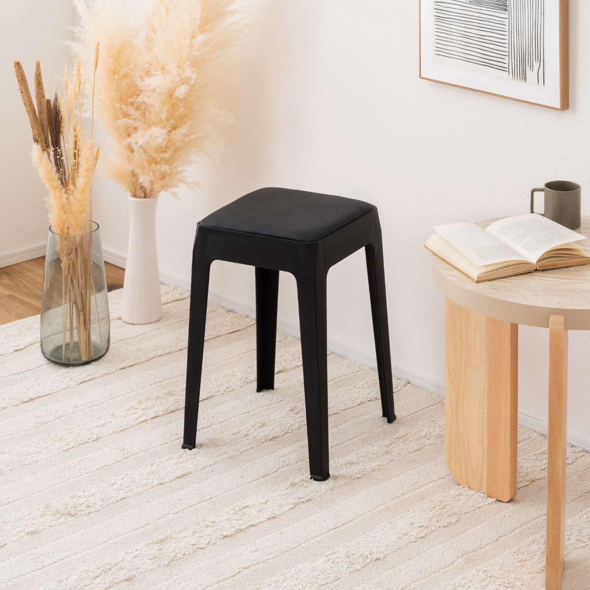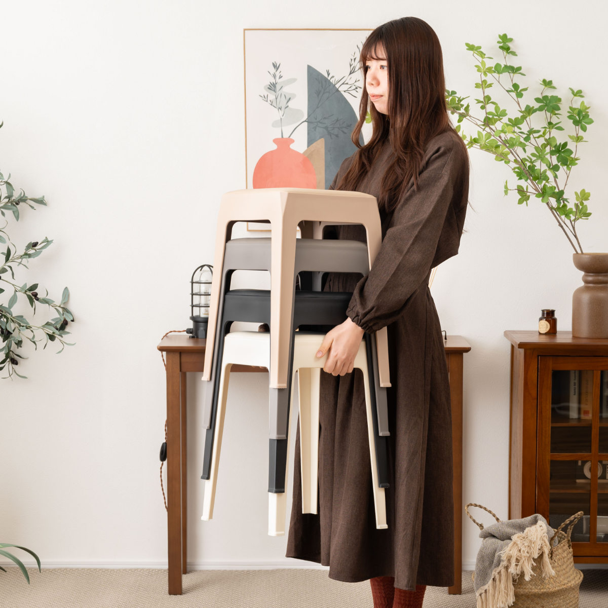 使わないときは重ねてすっきり収納できます。重ねた姿も美しく、生活感を抑えながらインテリアの一部として空間に溶け込みます。複数脚揃えても場所を取りにくいので、来客用としてもお使いいただけます。