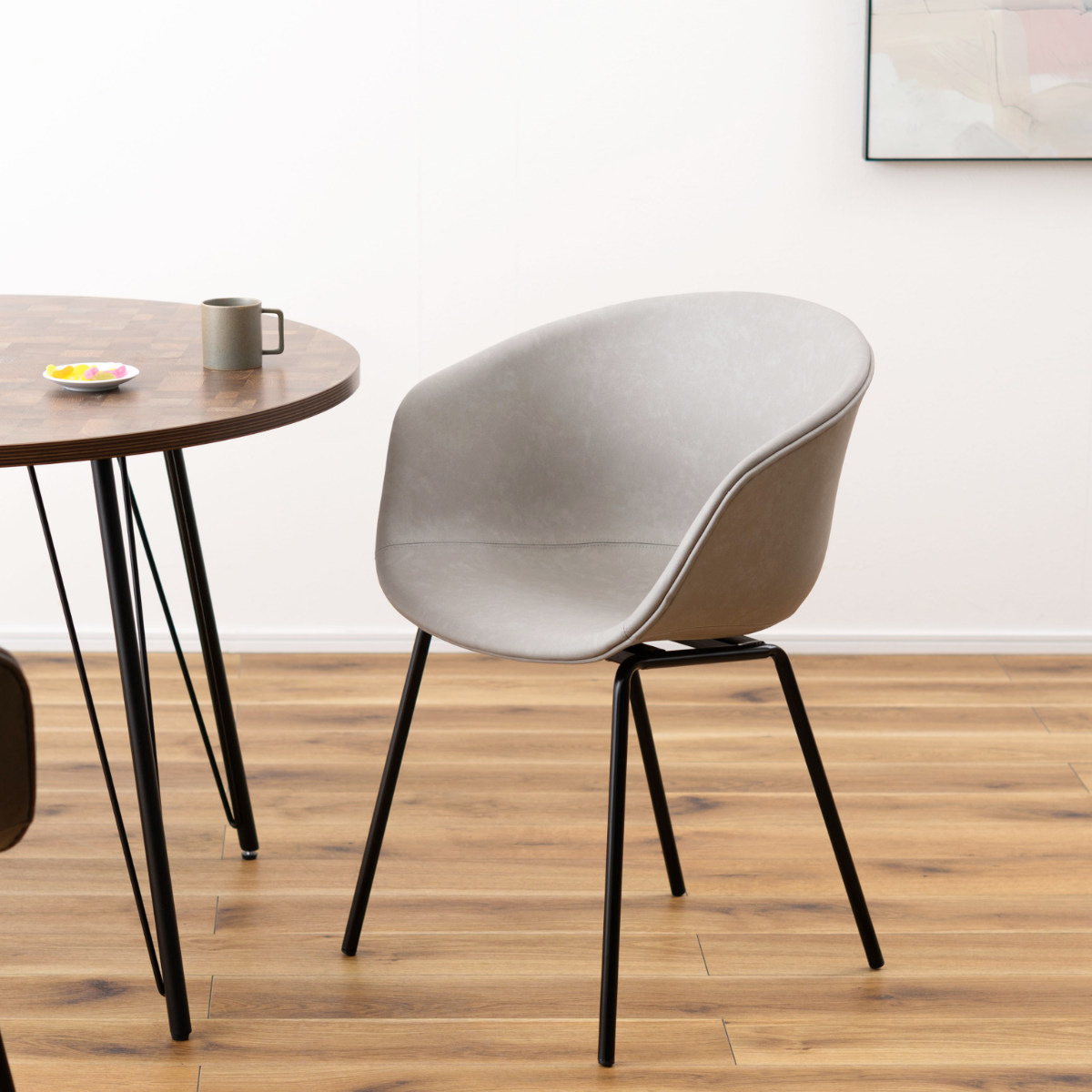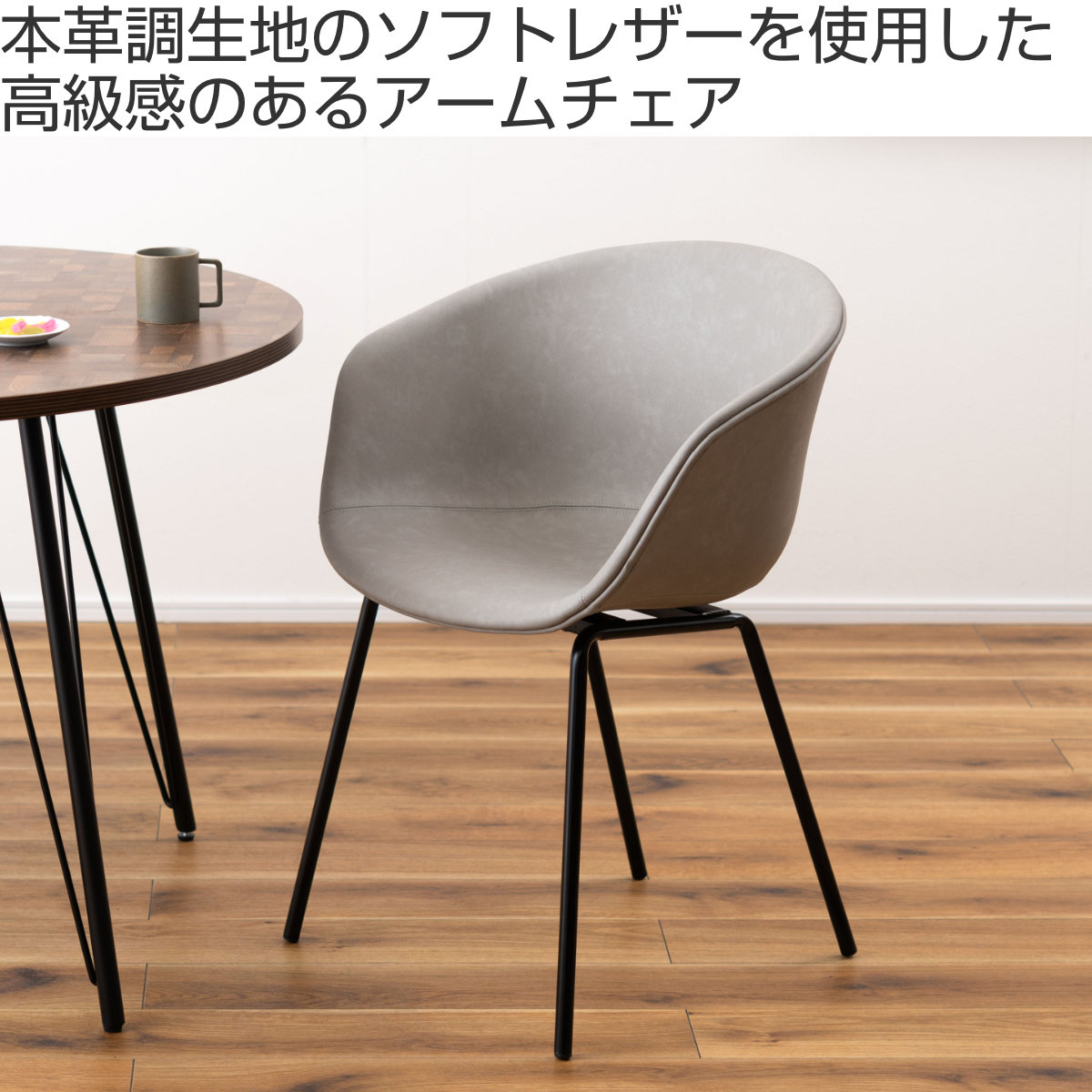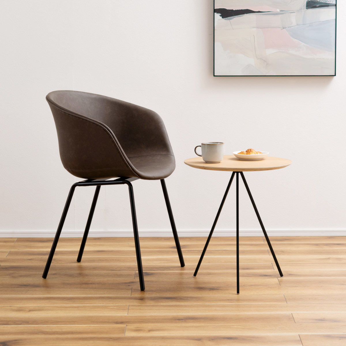 華奢でスタイリッシュなスチール脚が全体をすっきりとした印象に。重たく見えがちなアームチェアも軽やかにまとまり、ダイニングやワークスペースにも取り入れやすいデザインです。