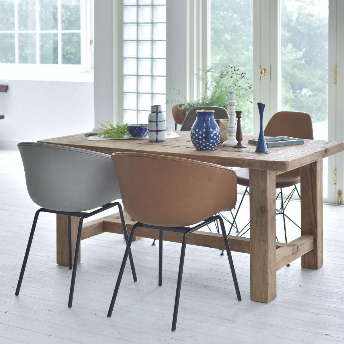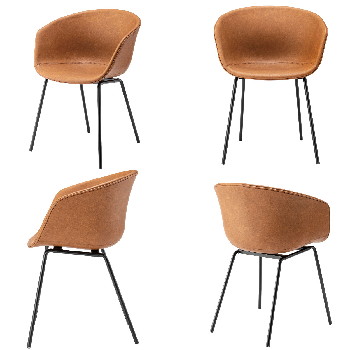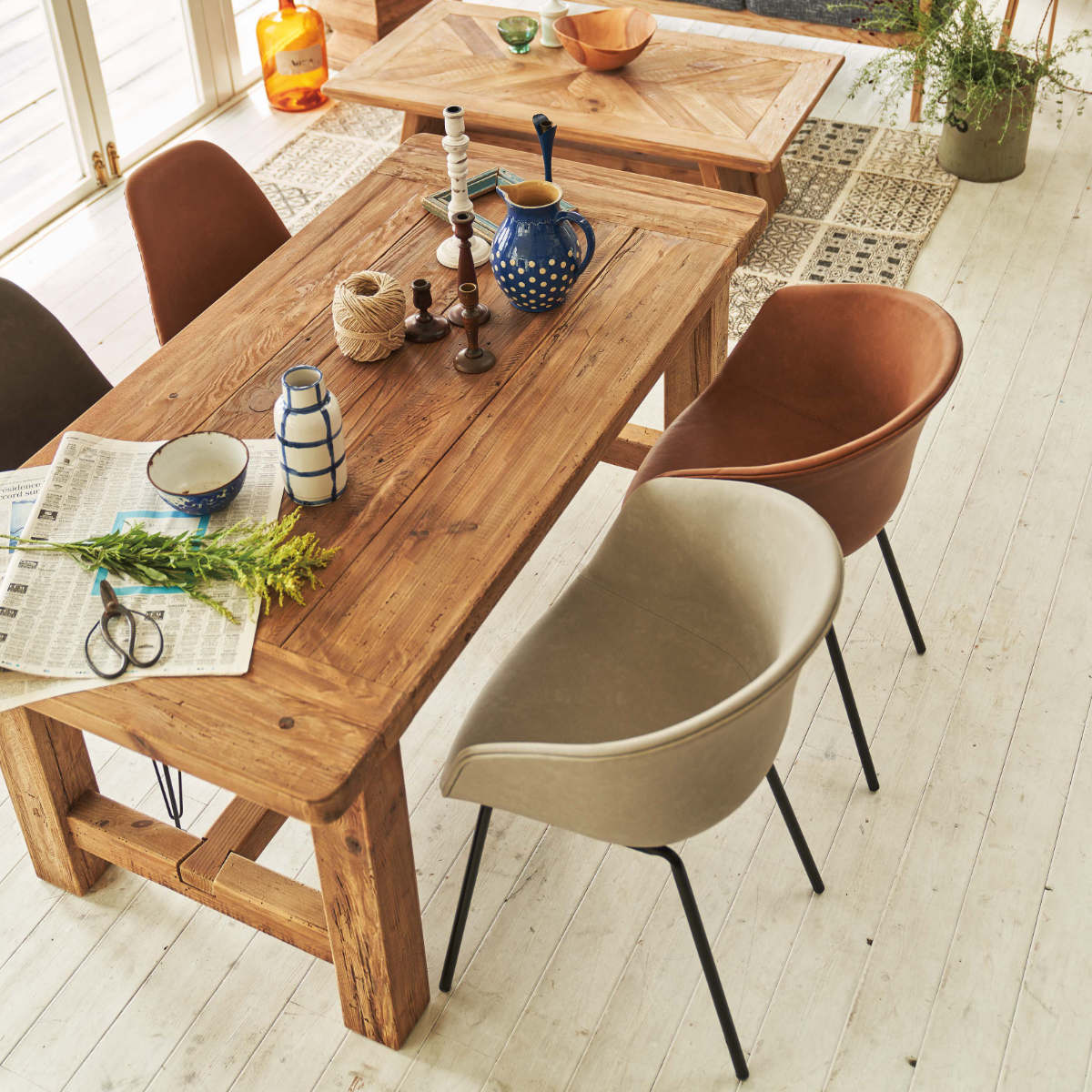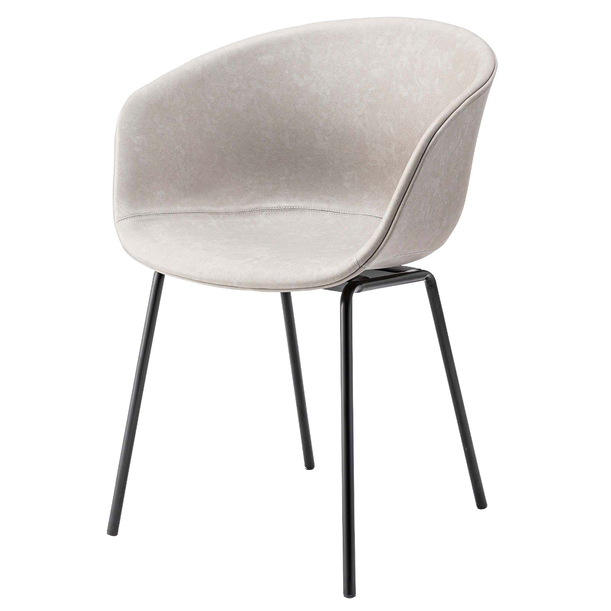 華奢でスタイリッシュなスチール脚が全体をすっきりとした印象に。重たく見えがちなアームチェアも軽やかにまとまり、ダイニングやワークスペースにも取り入れやすいデザインです。