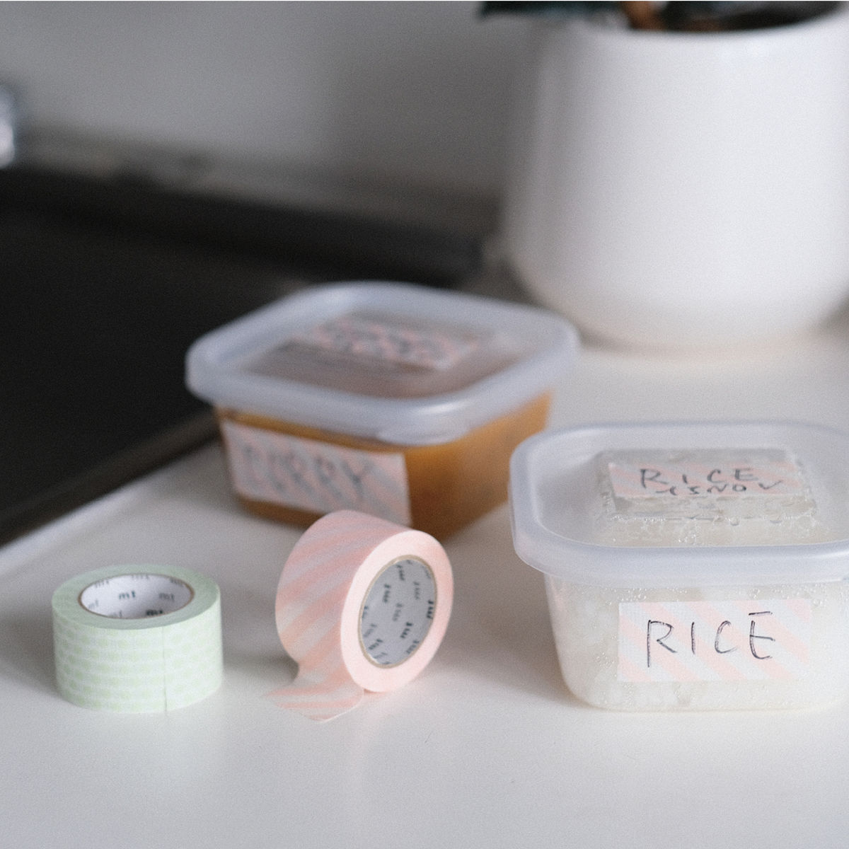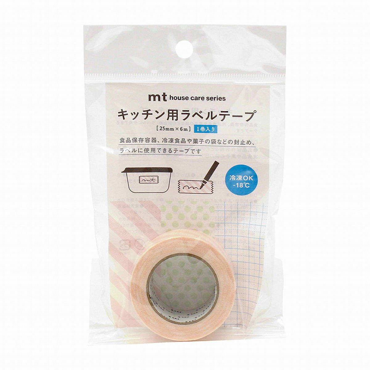 貼って剥がせるキッチン用ラベルテープです。食品保存容器のラベルをはじめ、冷凍食品やお菓子袋の密封・仮止め、ゴミ袋の補強など、幅広い用途にお使いいただけます。