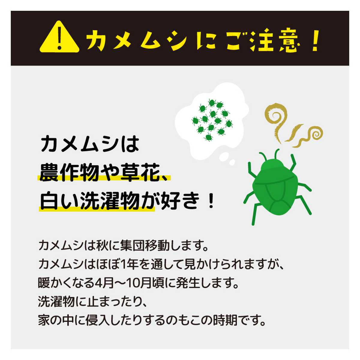 カメムシは一年を通して見かけることがありますが、特に暖かくなる4月~10月頃に発生しやすい害虫です。洗濯物への付着や室内への侵入を防ぐため、気になる場所に設置してください。