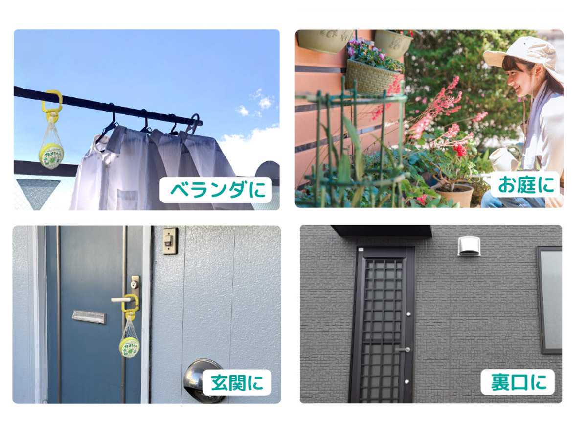 ●ベランダやお庭、玄関、勝手口など、気になる場所に掛けるだけで手軽に設置できます。