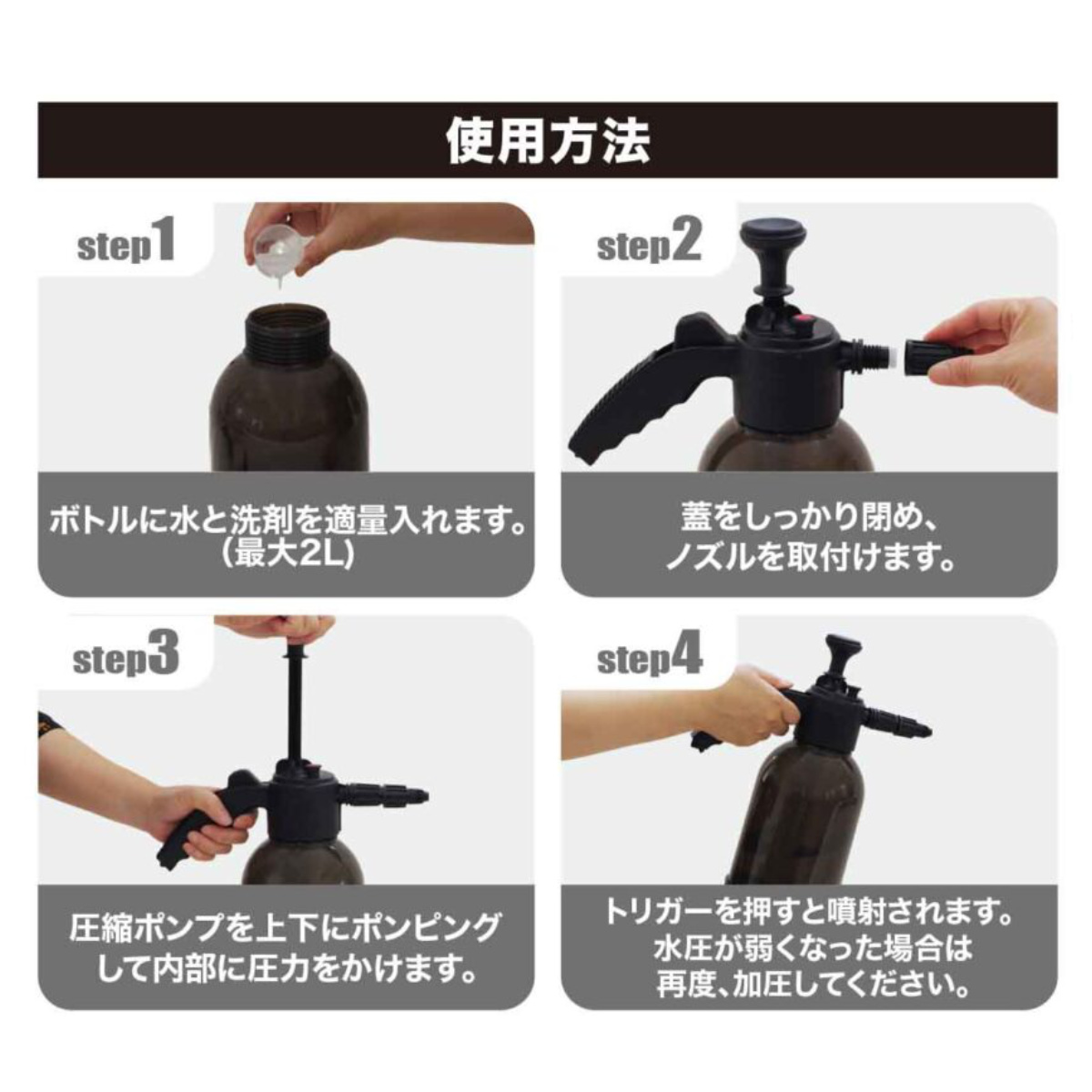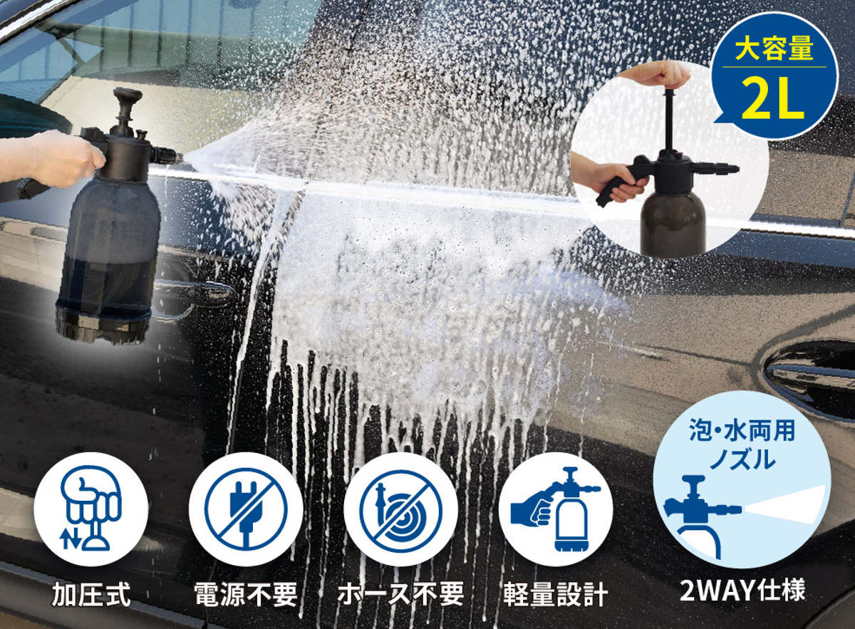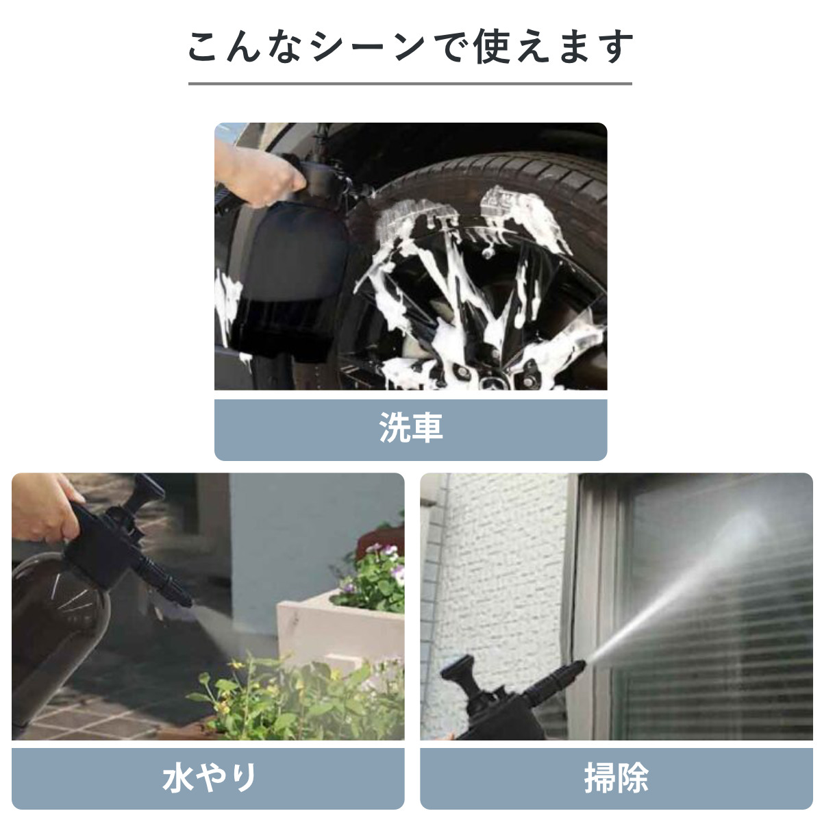 手動で加圧して噴射できる洗浄スプレーです。用途に合わせてノズルを切り替えでき、広範囲噴射でお掃除時間をグッと短縮。洗車からベランダ掃除、ガーデニングまで幅広く使えます。