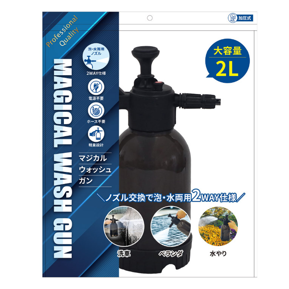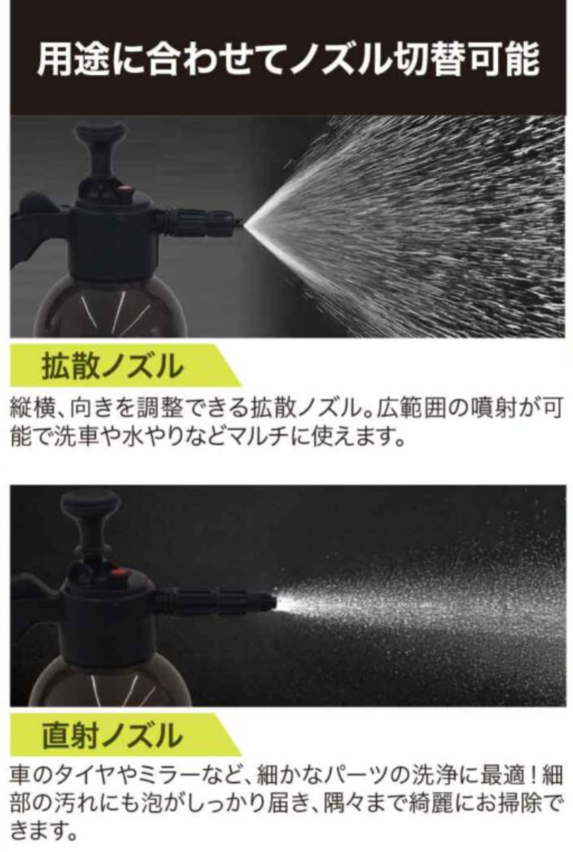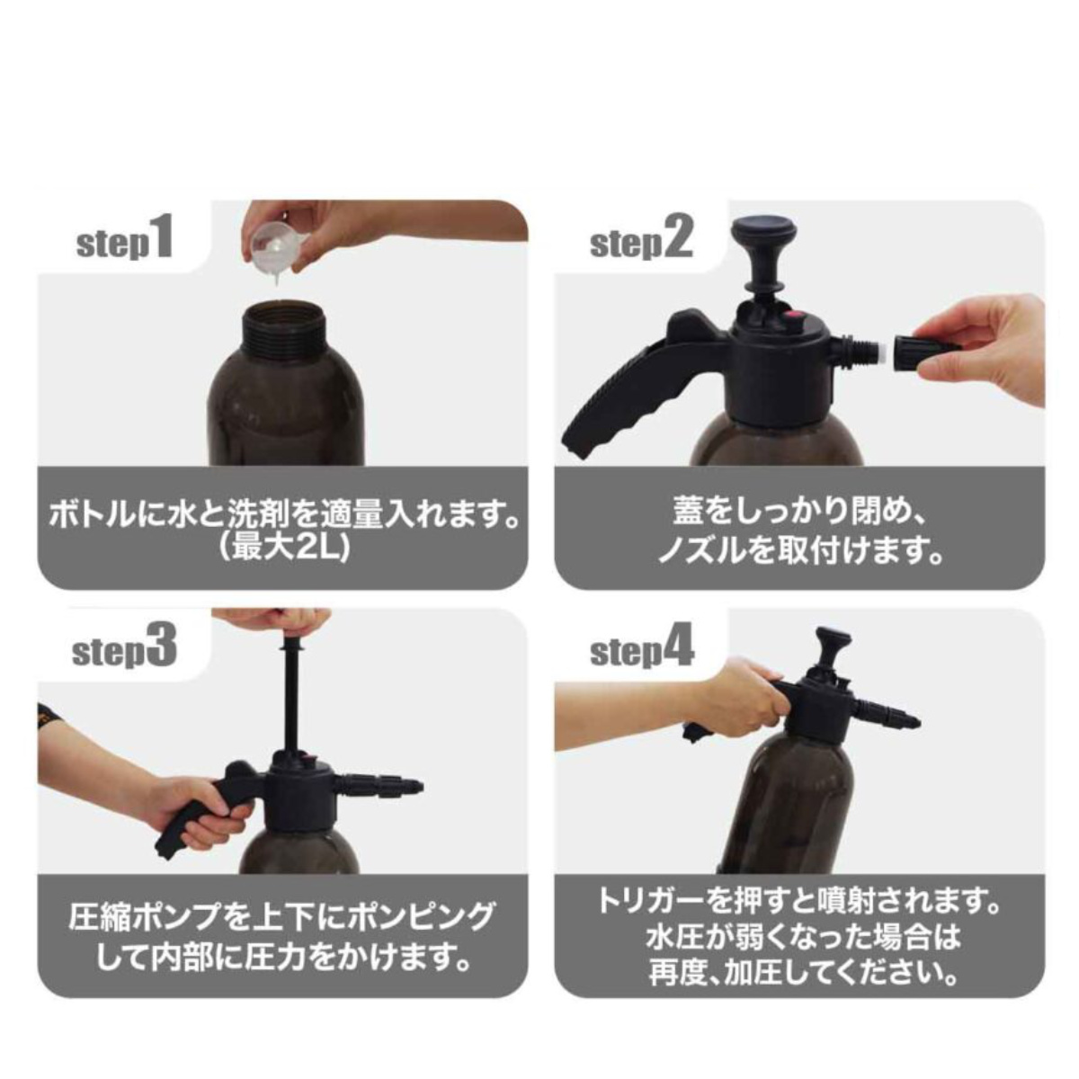 手動で加圧して噴射できる洗浄スプレーです。用途に合わせてノズルを切り替えでき、広範囲噴射でお掃除時間をグッと短縮。洗車からベランダ掃除、ガーデニングまで幅広く使えます。