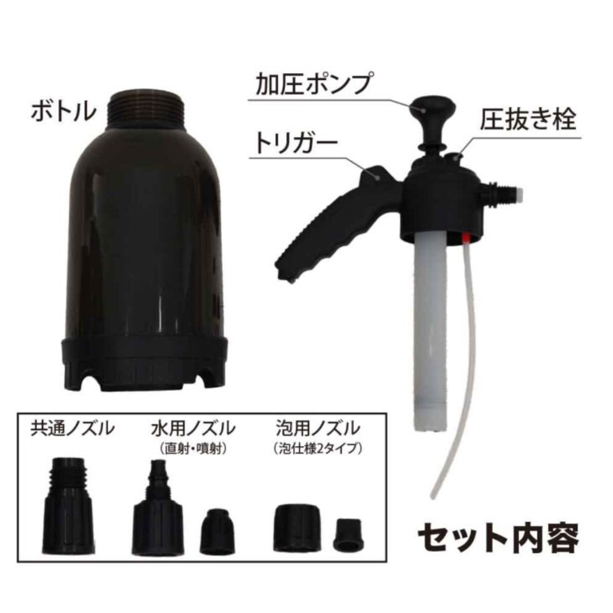 | 内容量 | 本体、ボトル、共通ノズル、水用ノズル(直射・噴射)、泡用ノズル(2タイプ) |