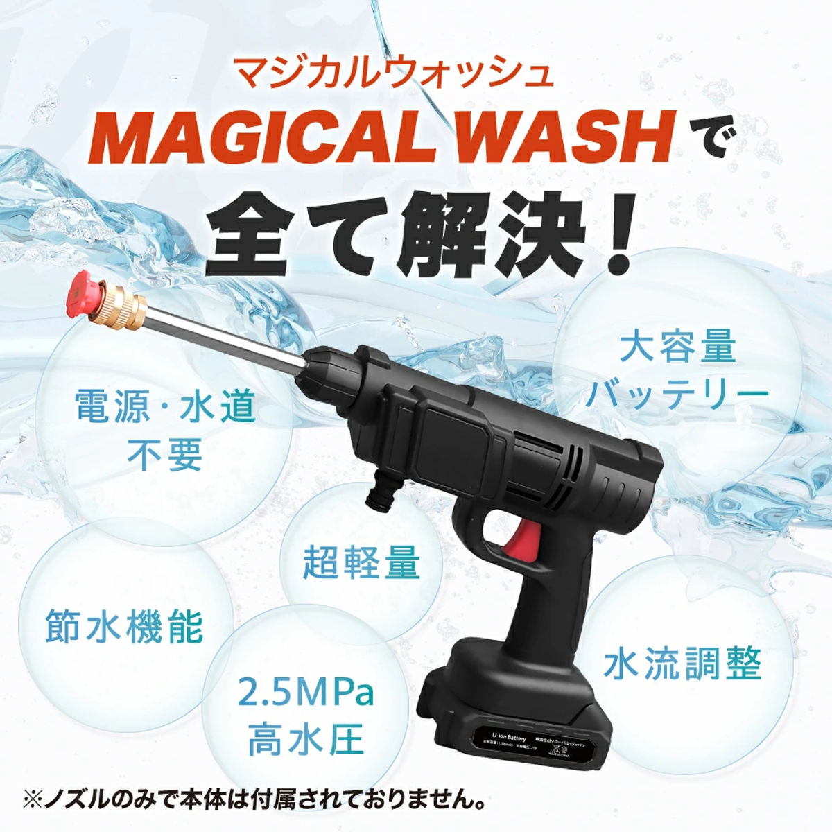 ●バケツと本体を用意するだけで使えるコードレス高圧洗浄機「マジカルウォッシュ」の交換用バッテリーです。