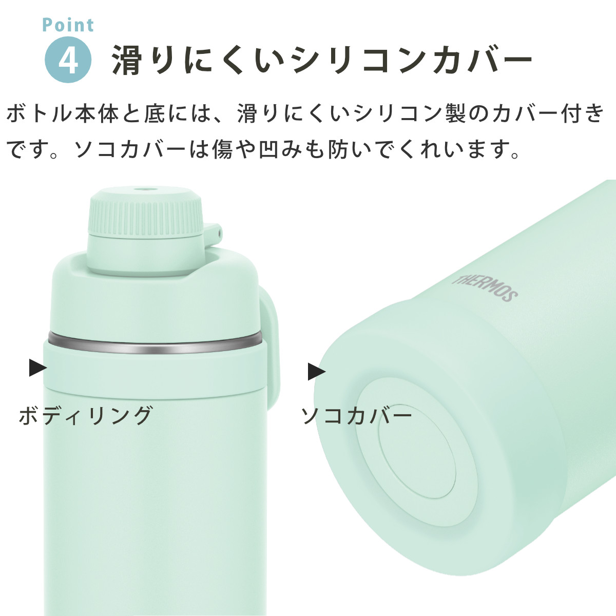 | 材質 | 内びん:ステンレス鋼 胴部:ステンレス鋼(アクリル樹脂塗装) 蓋、ループ、キャップ本体、飲み口:ポリプロピレン 蓋パッキン、シールパッキン、ボディリング、ソコカバー:シリコーンゴム |