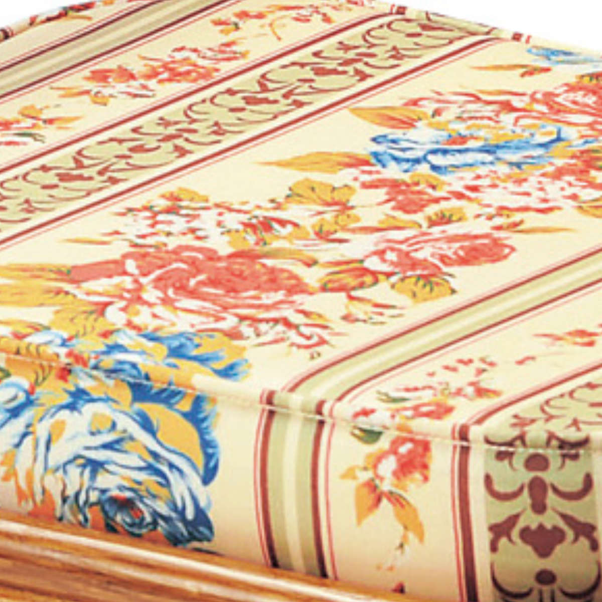 温もりを感じるハニーブラウン塗装のフレームに、華やかなファブリッククッションを組み合わせ、和室・洋室どちらにも自然に馴染むデザインです。