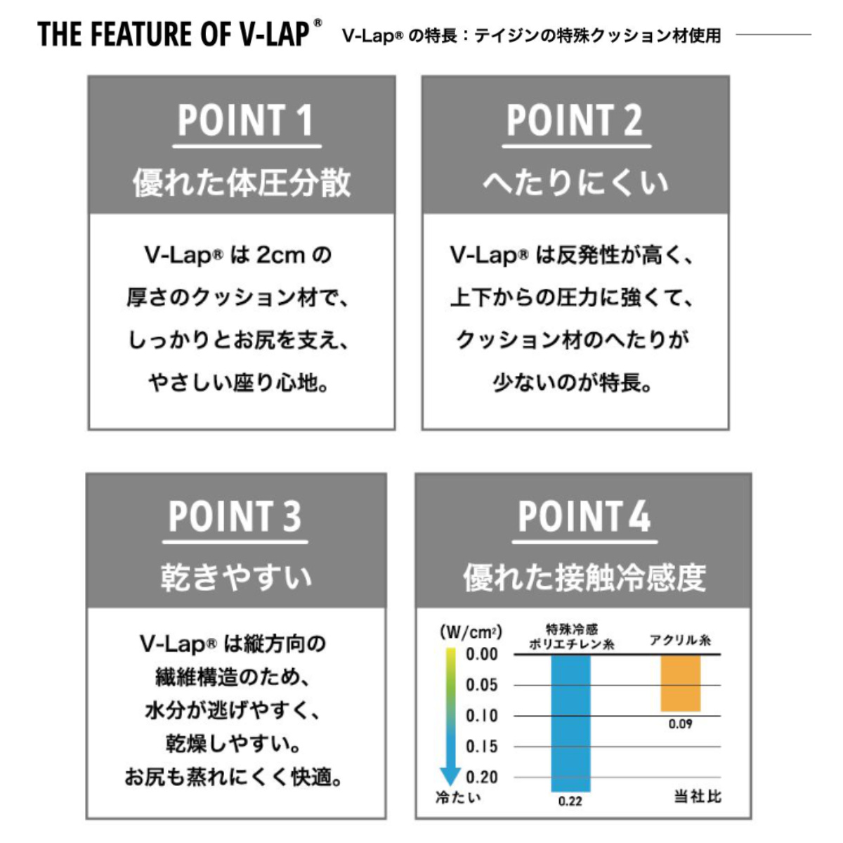 クッション材にはテイジンの特殊クッション材V-Lapを使用。優れた体圧分散でしっかりお尻を支え、やさしい座り心地を実現しました。上下の圧力に強いので、へたりにくいです。水分が逃げやすく、乾燥しやすいのも特徴です。