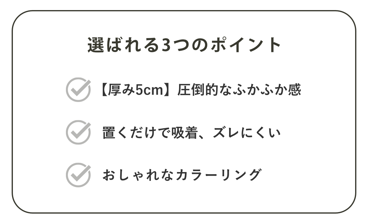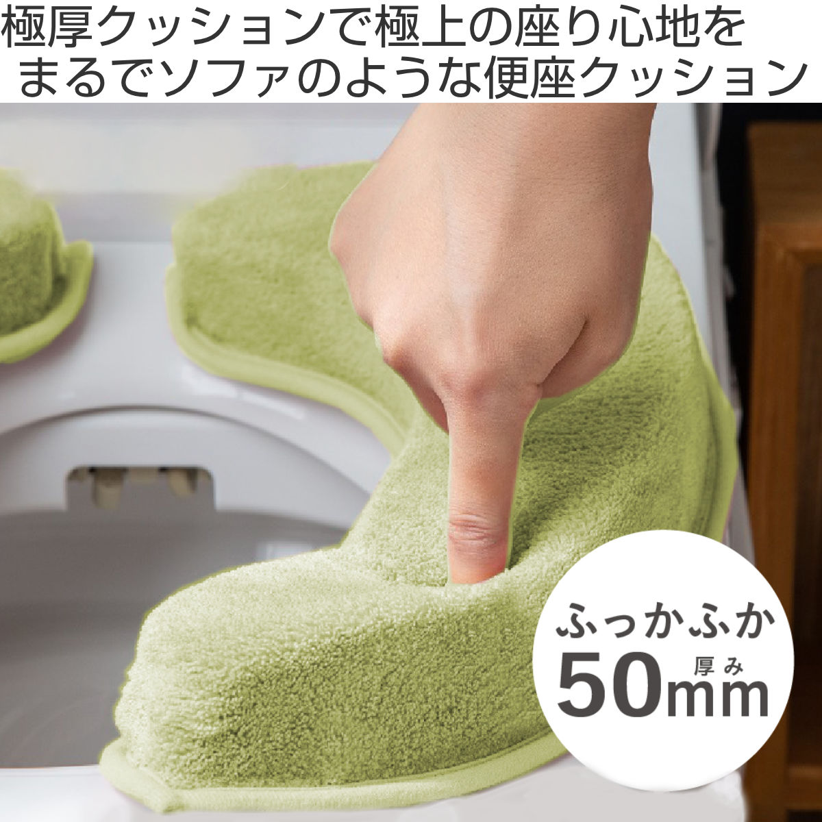 まるでソファのような座り心地を実現する、ふかふかさを極めた便座クッションです。厚さ5cmの極厚クッションが便座を柔らかく包みこみ、長時間座っても疲れにくいです。圧倒的なボリューム感が、いつものトイレを贅沢な癒し空間へと変えます。