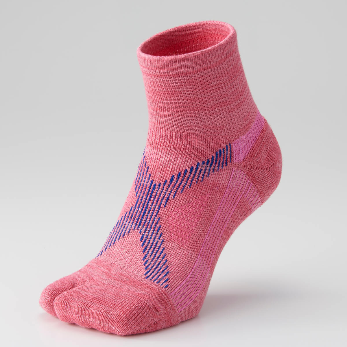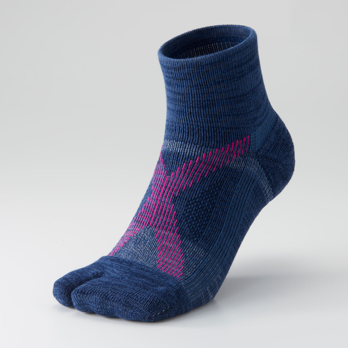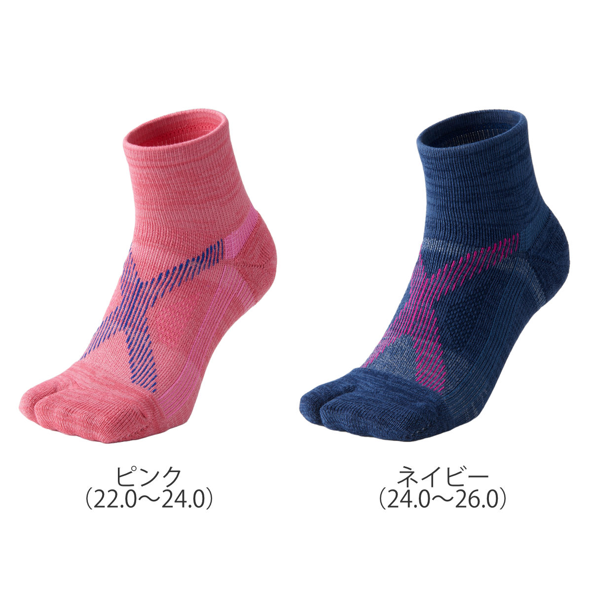 疲れにくい歩き方をサポートする高機能ウォーキングソックスです。足袋型形状で指に力が入りやすく、踏ん張りの効いた安定した歩行を実現します。